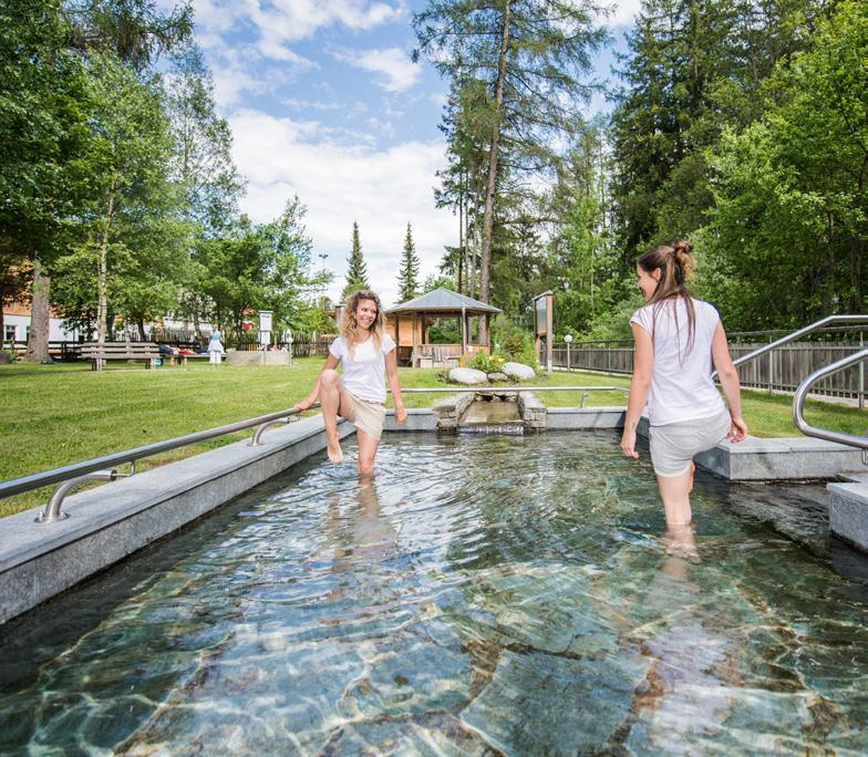 Barfuß über den Waldboden laufen, auf der Naturwiese tautreten, die Beine ins kalte Wasser tauchen und auf der Liege aus Zirbenholz entspannen, während der nahegelegene Bach sanft vor sich hin rauscht: Im Raiffeisen-