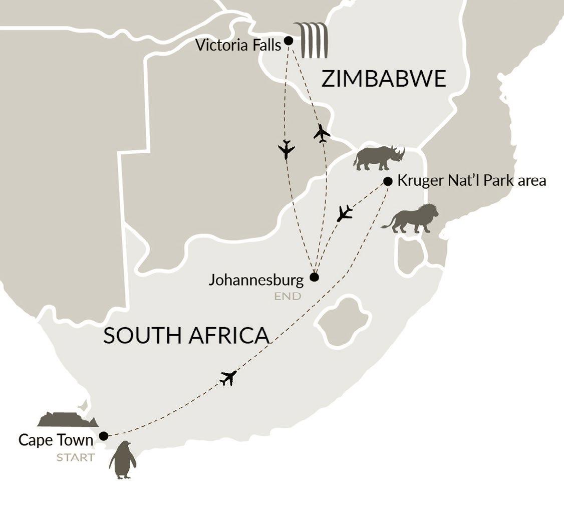 Explore Cape Town, take in the views from Table Mountain and enjoy a private guided tour along the Cape Peninsula. Spot leopards, lions, zebras and more on safari drives in the Kapama Game Reserve near the Kruger National Park. Be awed by the majesty of Victoria Falls.