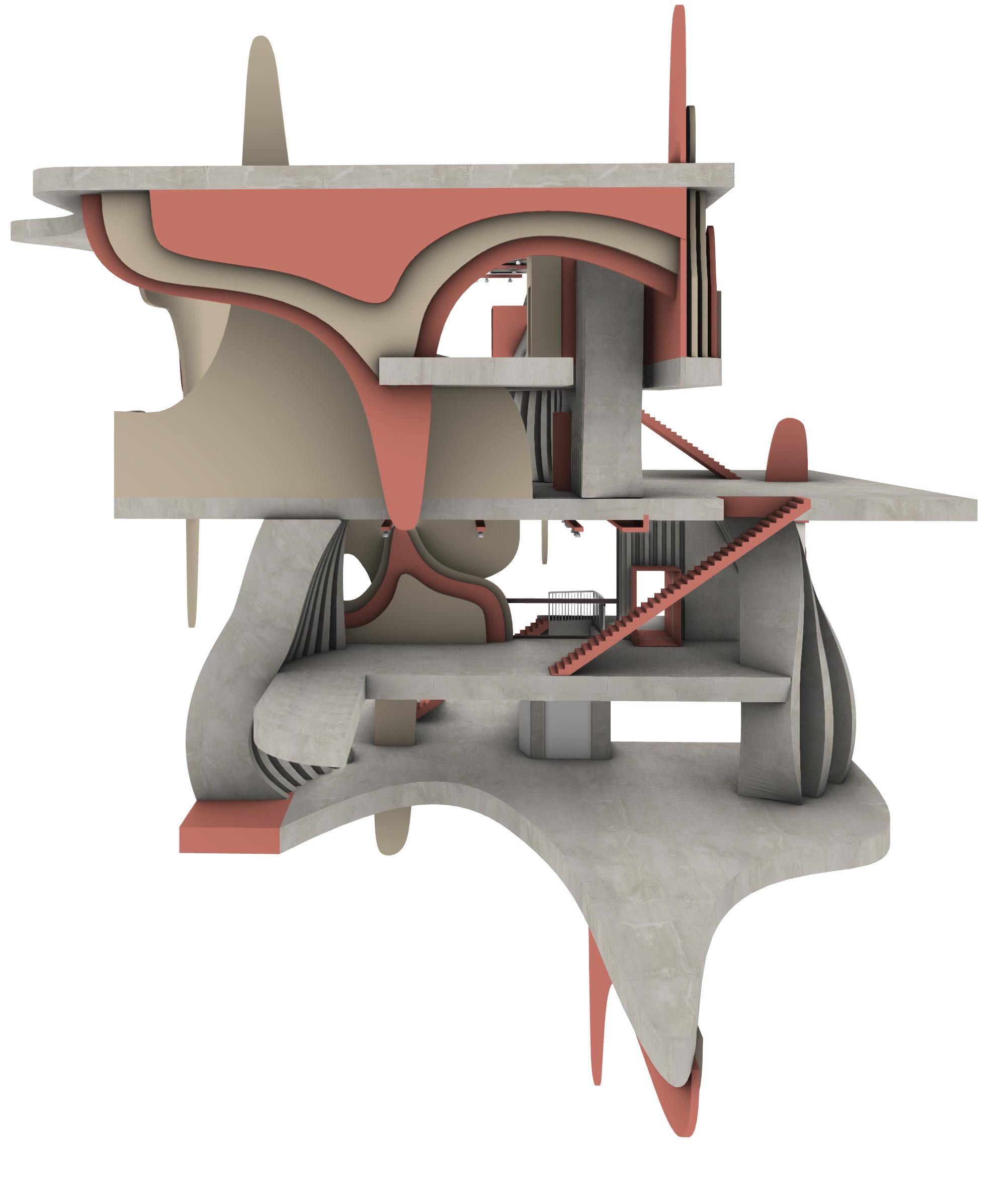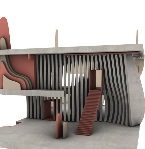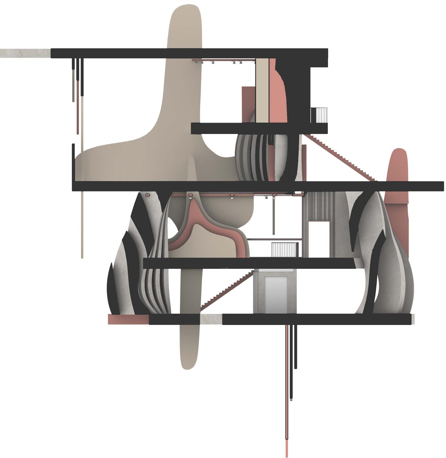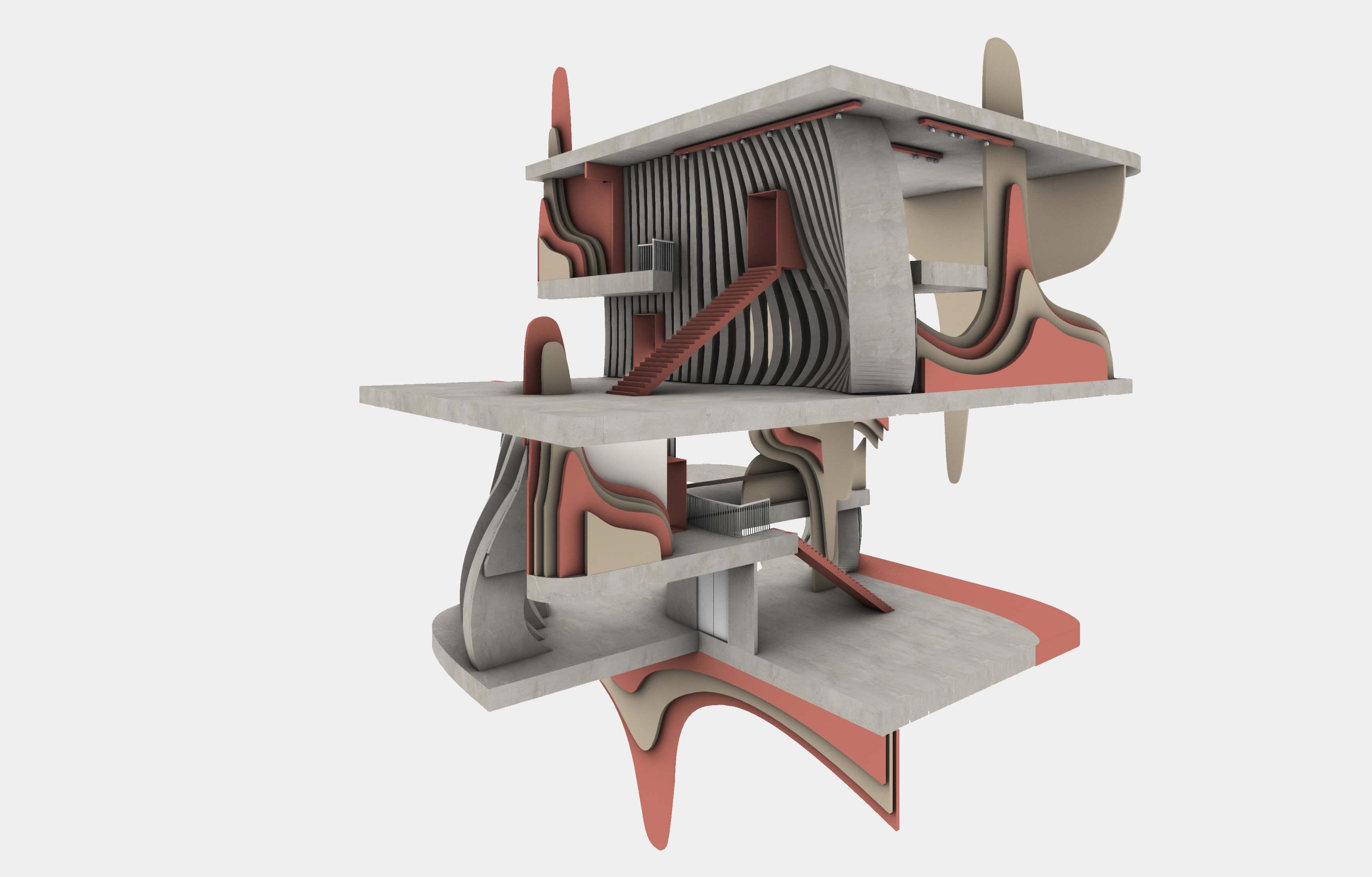 This project explores coloration and parametric fragments. In regards to the parametric fragments, there are two patterns of exploration that occur throughout the space: one a parametric object and a topographic object. The parametric object that serves as interior partitions, letting views and light into the interior spaces. And the topographic object serves as exterior partitions in most instances.