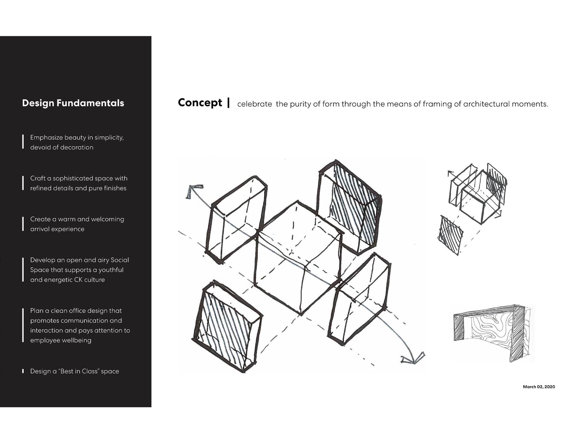 My design team and I set out to create a modern workplace that reflects Calvin Klein’s heritage and establishes a consistent unified expression of CK’s brand, culture and future vision. We wanted to emphasize beauty in simplicity, devoid of decoration, concentrate on purity of form and architecture, craft a sophisticated space with refined details and pure finishes, create a warm and welcoming arrival experience, develop an open and airy Social Space that supports a youthful and energetic CK culture, plan a clean office design that promotes communication and interaction and pays attention to employee wellbeing, and design a “Best in Class” space to reflect the brand's DNA. Calvin Klein once said " believe in pairing something down to its essence, where line, color, and form are all. There is beauty in simplicity, grace in understatement", and that is what we set out to do with the architecture of the space - celebrate the purity of form through the means of framing of architectural moments.