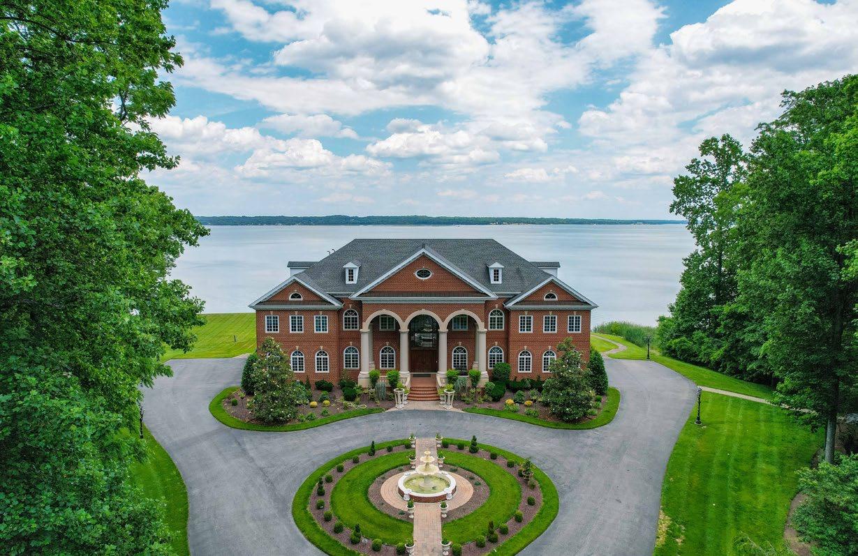 Discover an exquisite waterfront haven at The Estate on Dos Santos Way, nestled along the tranquil Patuxent River. This all-brick masterpiece, spanning 16,744 square feet, blends unparalleled luxury with serene seclusion, offering breathtaking water views and a private family retreat. Step into a grand foyer crowned by a 27-foot domed ceiling, a sweeping double staircase, and a dazzling Swarovski crystal chandelier. Refined details like ornate moldings and elegant columns define the home’s sophisticated charm. The main level showcases a lavish owner’s suite, a two-story great room with floor-to-ceiling windows, and a gourmet kitchen featuring premium appliances. A 9-foot elevator seamlessly connects all levels. Upstairs, two additional primary suites and four spacious bedrooms, each with en-suite baths, provide ample comfort. The lower level is an entertainer’s dream, boasting a custom movie theater, grand ballroom, game room, gym, and a cozy family room with a fireplace.