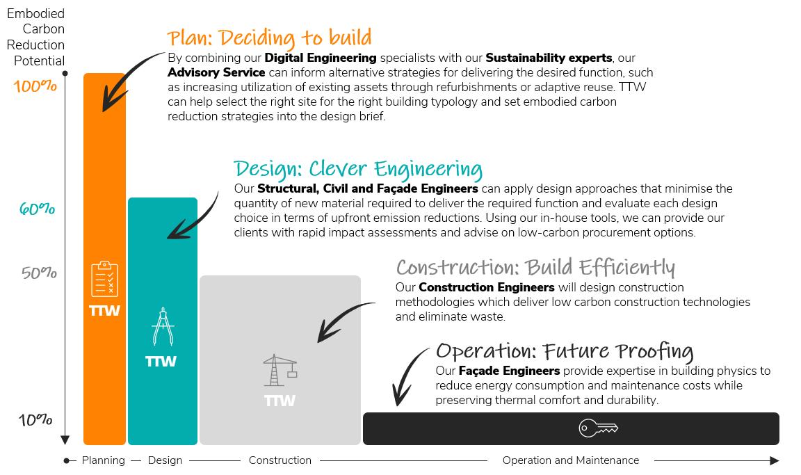 Without an industry standard to measure embodied carbon, TTW sees this as an opportunity to make a positive environmental impact by advising clients with strategies to reach their carbon reduction goals across the lifecycle of a project.