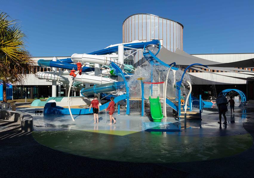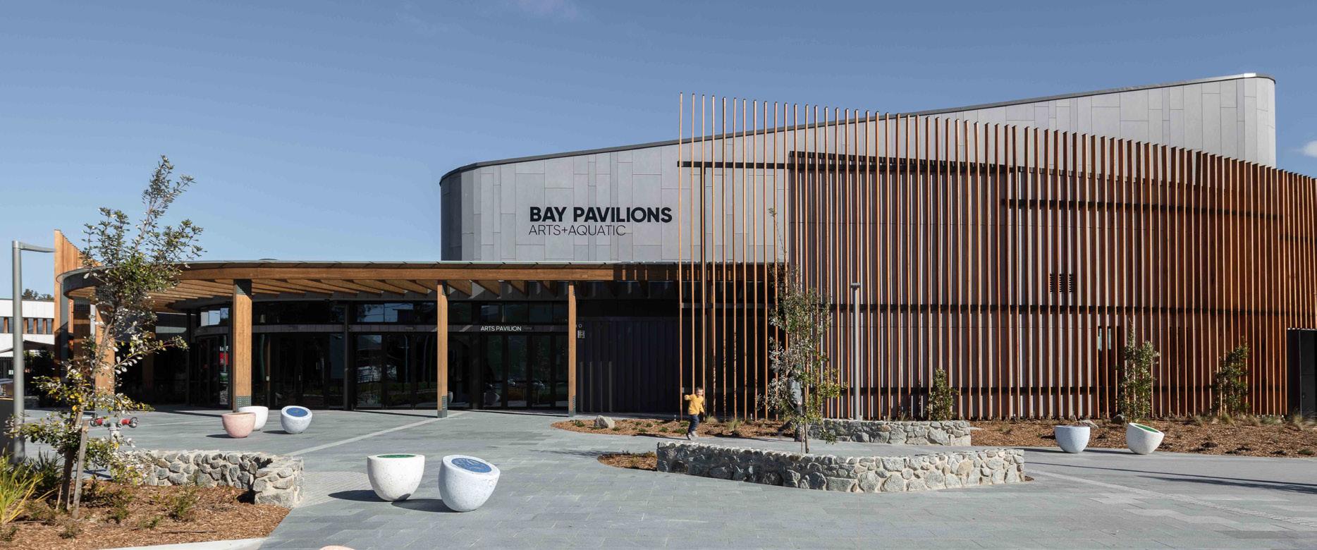 The Bay Pavilions incorporates indoor heated aquatic facilities including a 10-lane, 25-metre pool, hydrotherapy pool, leisure pool splashpad and water slide, health and fitness facility and performance and community art spaces. The building also features visitor centre facilities including exhibition area, café/bar and gallery.