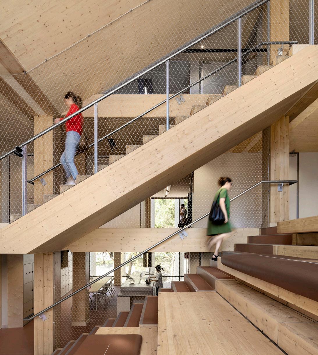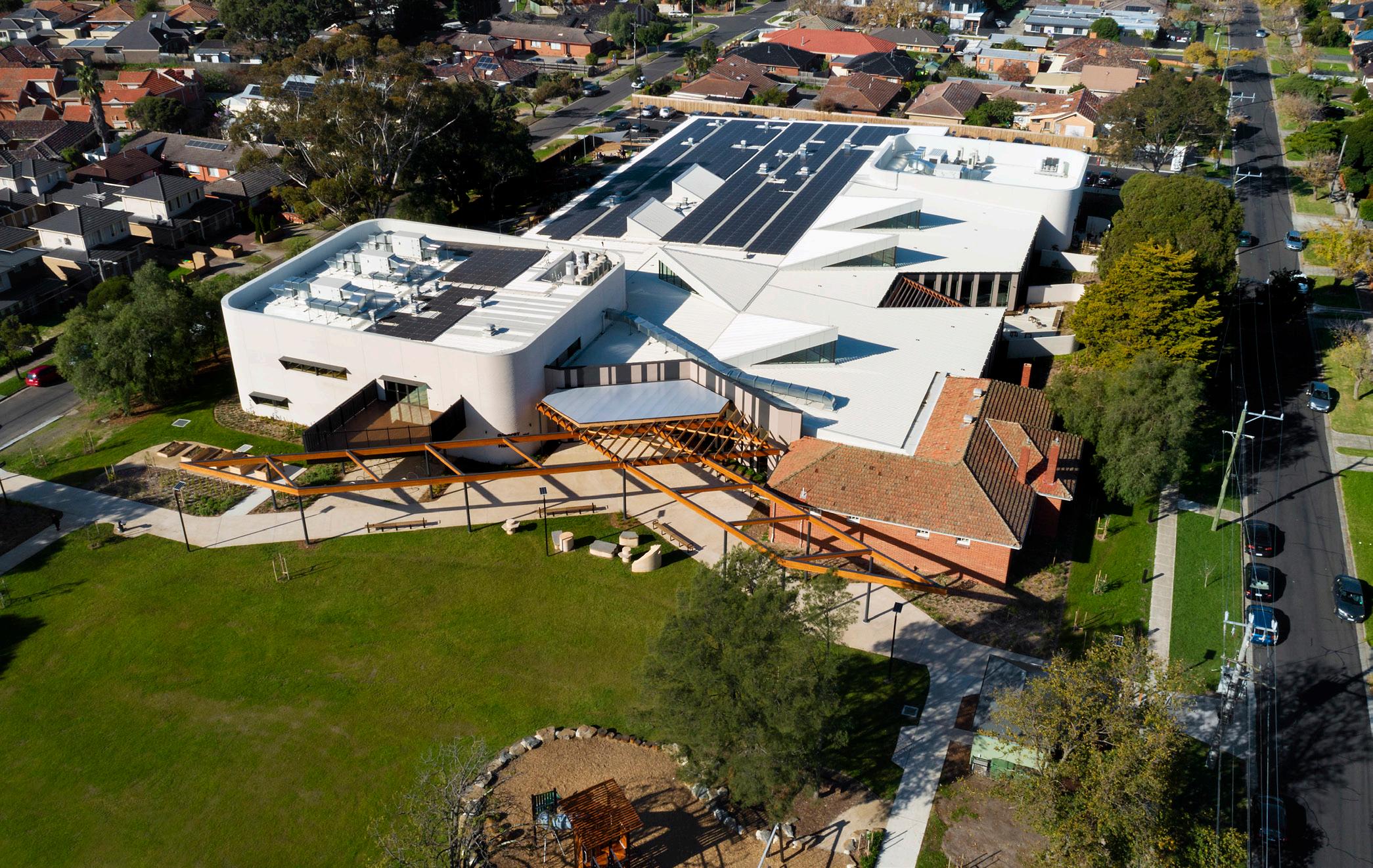 The total roof length is 20 metres with slender tapering glulam roof beams spanning the learning space, and cantilevering a further 3 metres over the perimeter veranda. The beams are supported by V columns of Victorian Ash. The roof timbers, shipped from Austria, had to fit in 12 metre long containers, which presented challenges to achieve the many junctions required between glulam beams. TTW engineers determined the optimal solution which involved internal flitch plates with steel dowels.