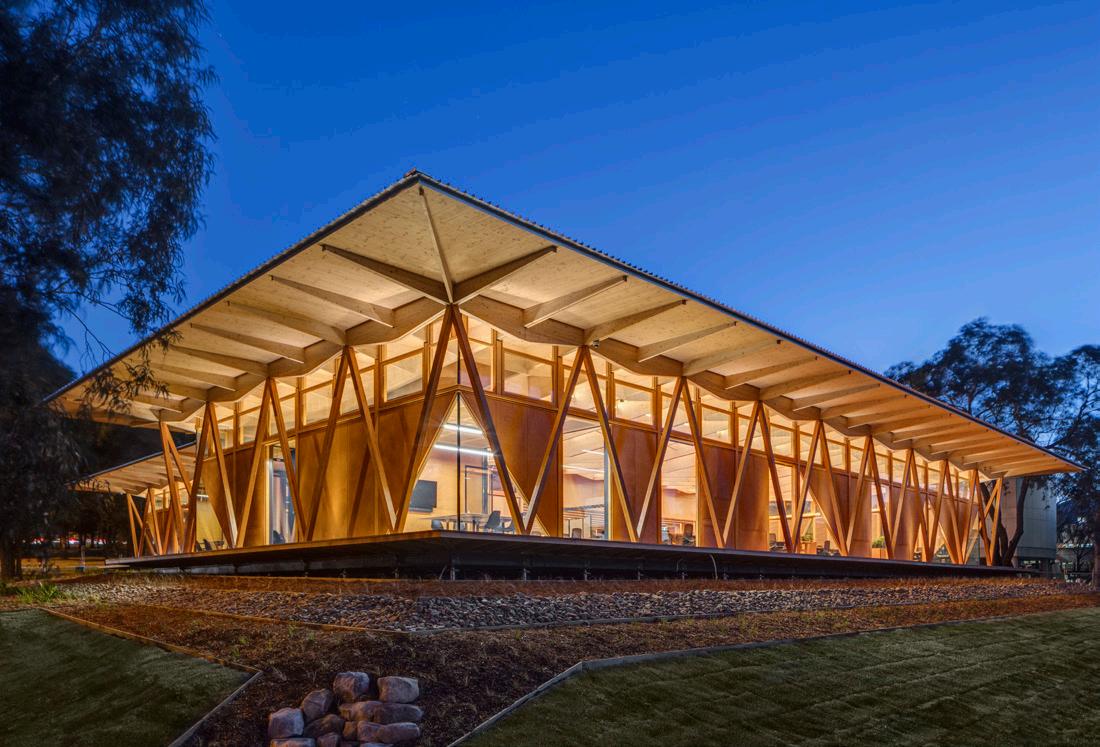 The guest lodge glulam trusses form a composite structure in compression spanning between curved steel trusses, with the whole roof supported on small steel columns. The steelwork in this system is clad internally and externally in blackbutt hardwood vertical strip boarding. In contrast, the exterior timber cladding was made out of solid blackbutt vertical strip boards with a bushfire rating of BAL 29.