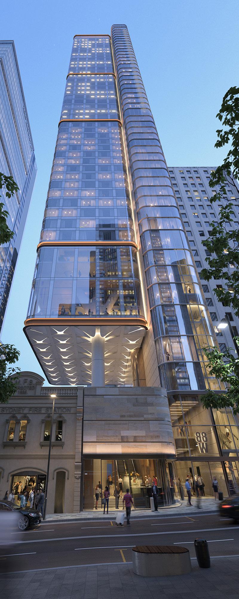 88 Walker is a unique building, occupying air space above a neighboring property. The 10 metre long cantilever transferring 45 storeys over the heritage-listed Firehouse Hotel led to a substantial composite steel and post tensioned concrete transfer structure being developed at the base.