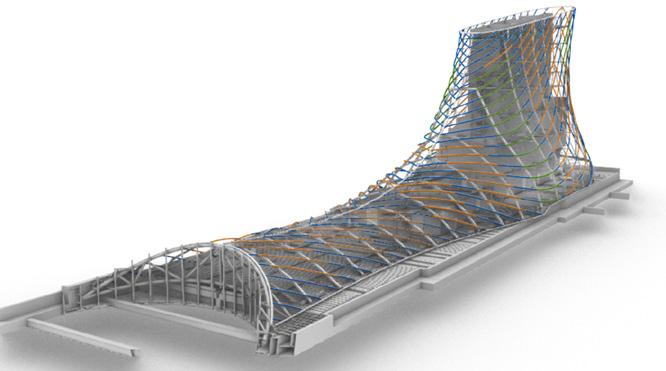 The 34-metre high freestanding steel structure created several challenges in designing for the high wind loads in the Queensland area. The impermeable ramp surface creates a large sail-like structure, and several complex node connections were required to provide an adequately braced steel structure and minimise lateral deflections.