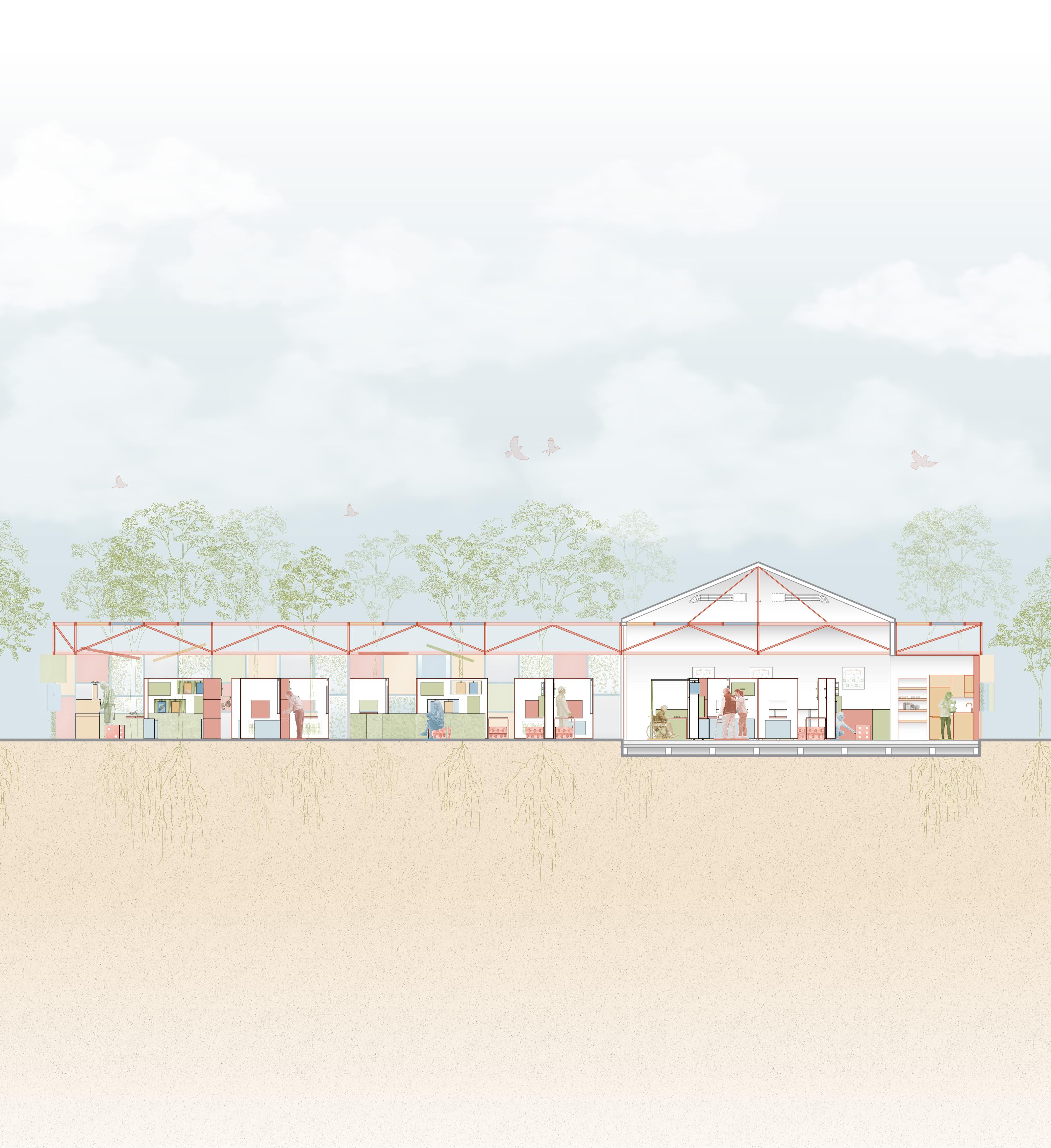 Originally centered on sacred architecture, the design shifted as research into dementia and memory loss reshaped our priorities. The focus moved away from symbolism and toward cognitive and emotional support--considering how sequencing, visibility, and natural light could aid orientation and reduce anxiety. Through iterative plans and sections, circulation was refined to feel intuitive rather than disorienting. Material consistency and gentle transitions create a sense of familiarity and grounding. The final proposal positions architecture not only as a place of gathering, but as a space capable of preserving dignity, supporting memory, and offering moments of calm for vulnerable users.