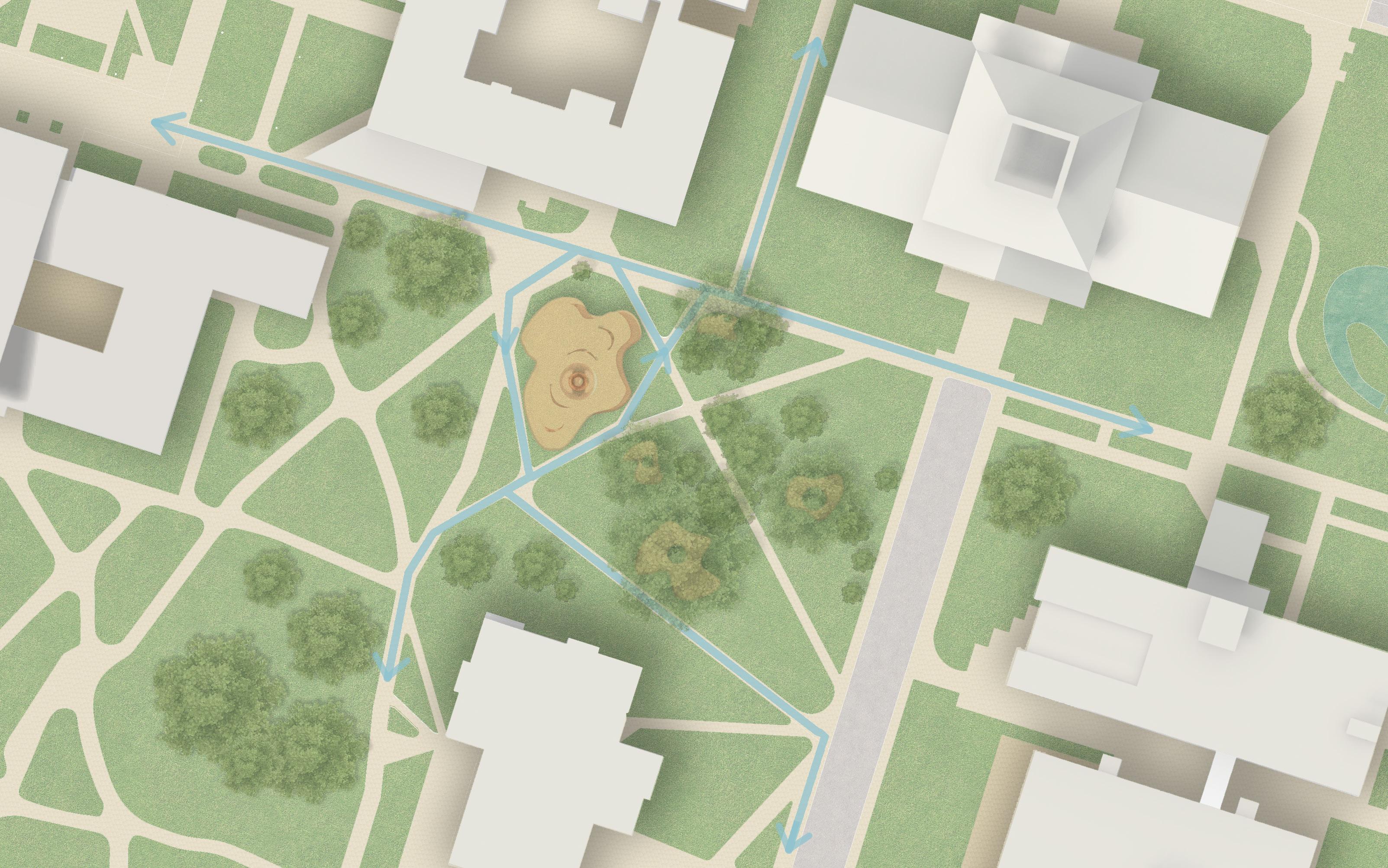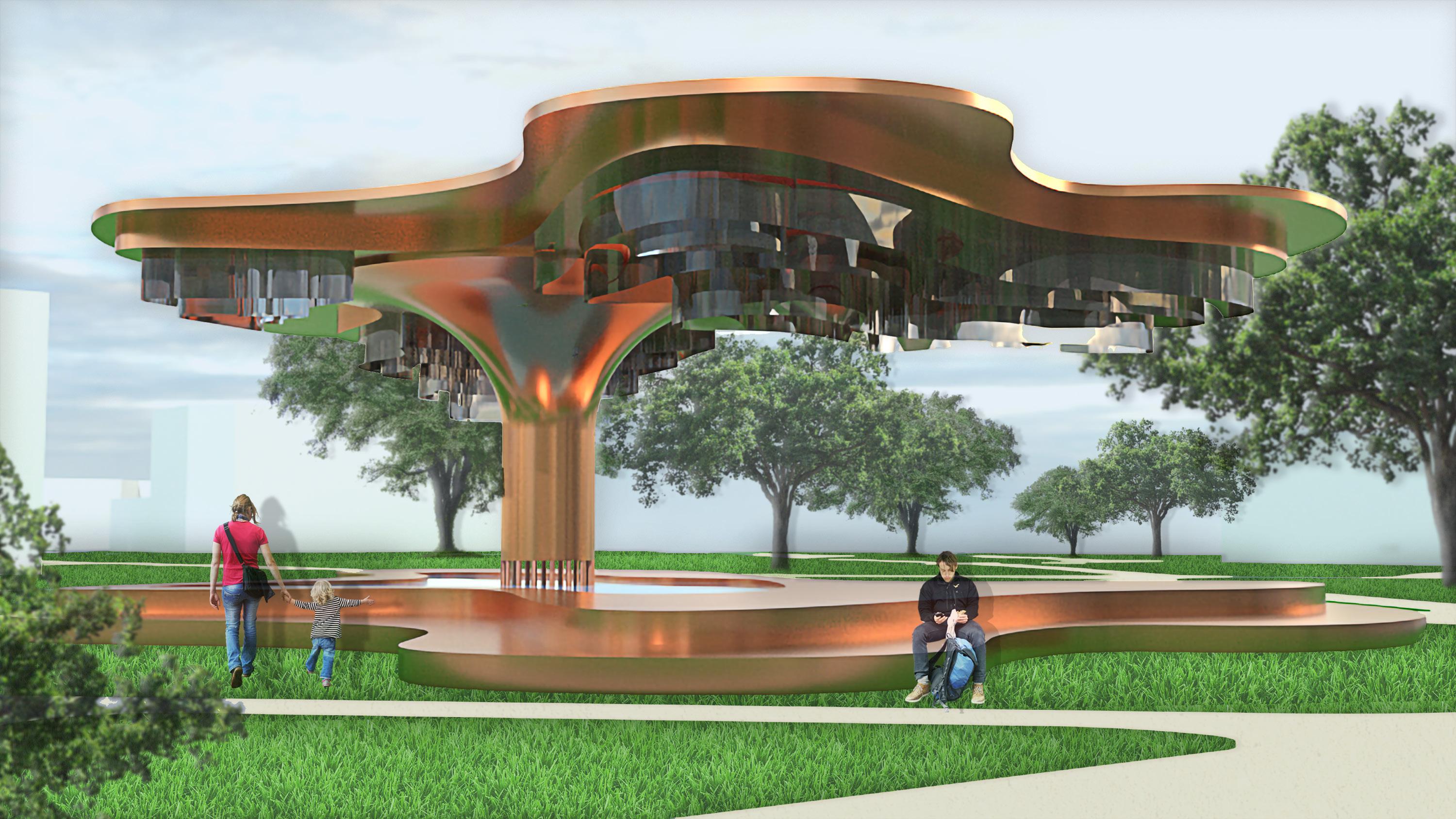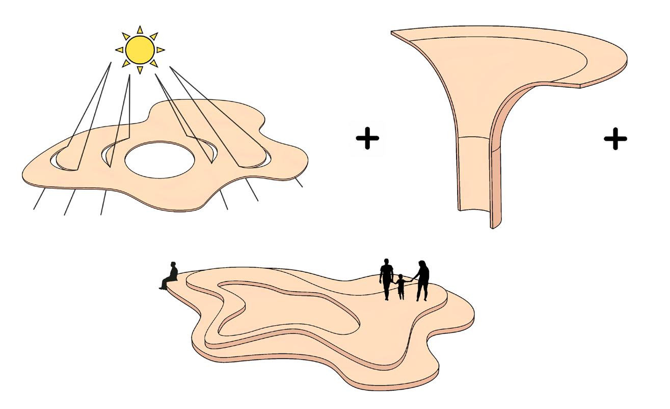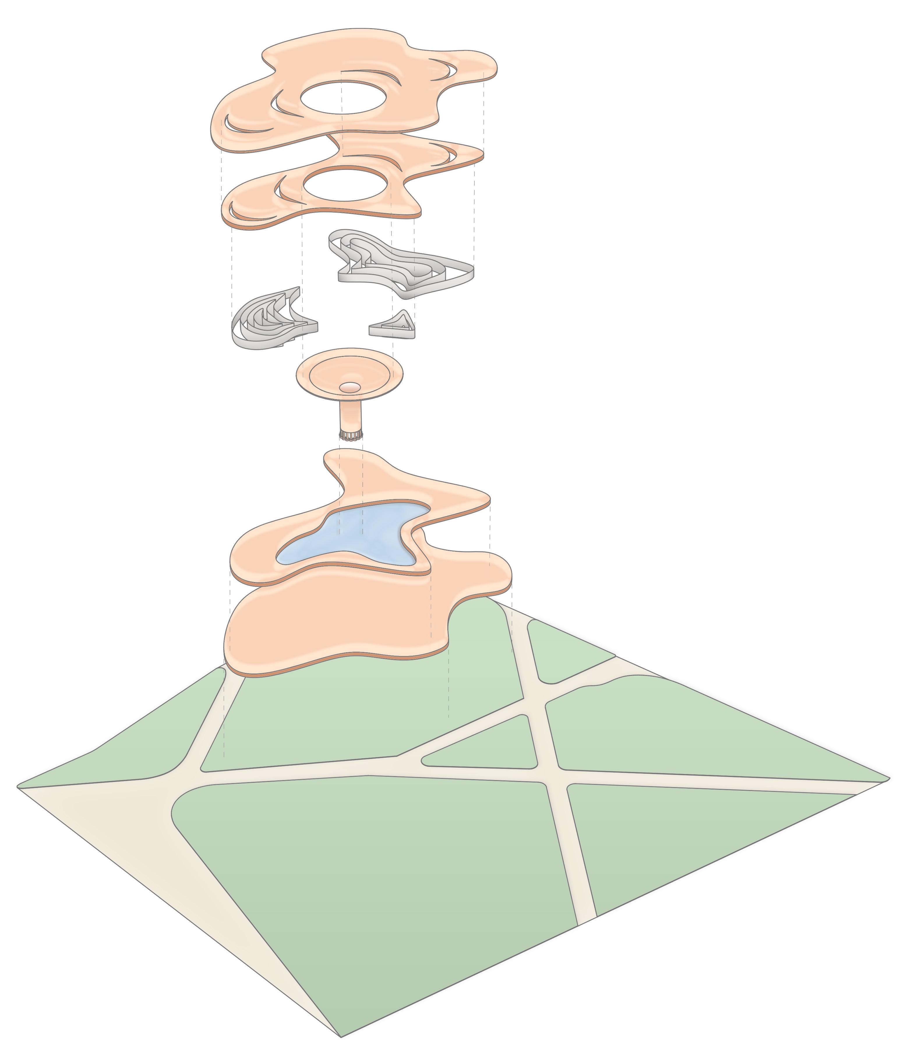 Inspired by the organic, wave-like forms of Lynda Benglis’ Summer Pavilion, this project reinterprets sculptural expression as inhabitable space. The pavilion functions as a resting and gathering area, where curved surfaces create integrated seating and moments for pause. Its funnel-like form collects rainwater and directs it toward a central pond, transforming environmental function into a visible and experiential feature. Openings in the roof allow natural light to filter through, while a suspended mesh layer reinforces the fluid geometry and softens the space below. The design balances expressive form with usability, creating a structure that is both visually dynamic and comfortably inhabitable.