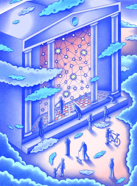 The theme of digitalisation always makes me think of a black box; as a layman, it can seem almost daunting to me how little many of us understand of such powerful, important developments. That formed the base of this image. Of course a contrary message is central in this issue: GovTech can solve many of our current problems if different disciplines join forces. I wanted to create an image in which the black box is transformed in a pleasant place where citizens want to go to interact with the government. When creating images, I always tend to highlight the whimsical of it all, emphasising the absurd, funny sides of themes in order to lighten them a bit.