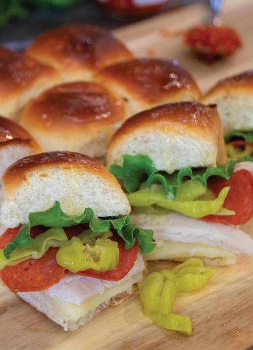 ITALIAN PARTY SANDWICHES: Tuck layers of salami, pepperoni, turkey, red onion and provolone cheese in Hawaiian rolls before baking until toasty. Brush with butter and some red pepper akes for heat.