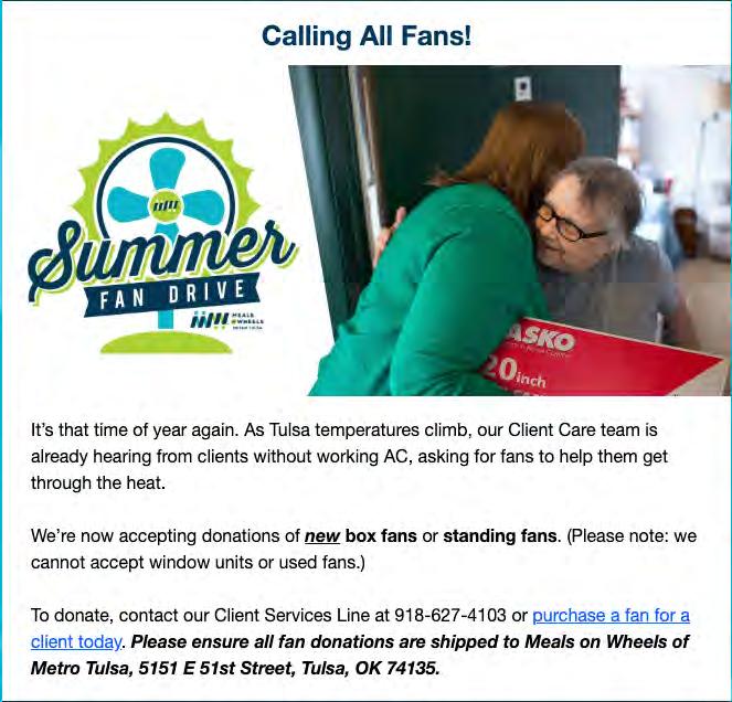 Donate a new fan in person at Meals on Wheels of Metro Tulsa or order one online and have it shipped to us directly. (5151 E. 51 Street) st Donate a fan today. MealsOnWheelsTulsa.org