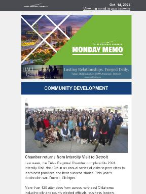 This weekly electronic newsletter is sent to all Chamber members, with a distribution of more than 6,700 individuals. Monday Memo is the primary means of communicating information about upcoming events, Chamber news and member celebrations. Sponsorship of Monday Memo is ideal for companies looking for both brand recognition and an effective way to drive traffic directly to their websites from a link within the email. The newsletter is sent out weekly January through December.