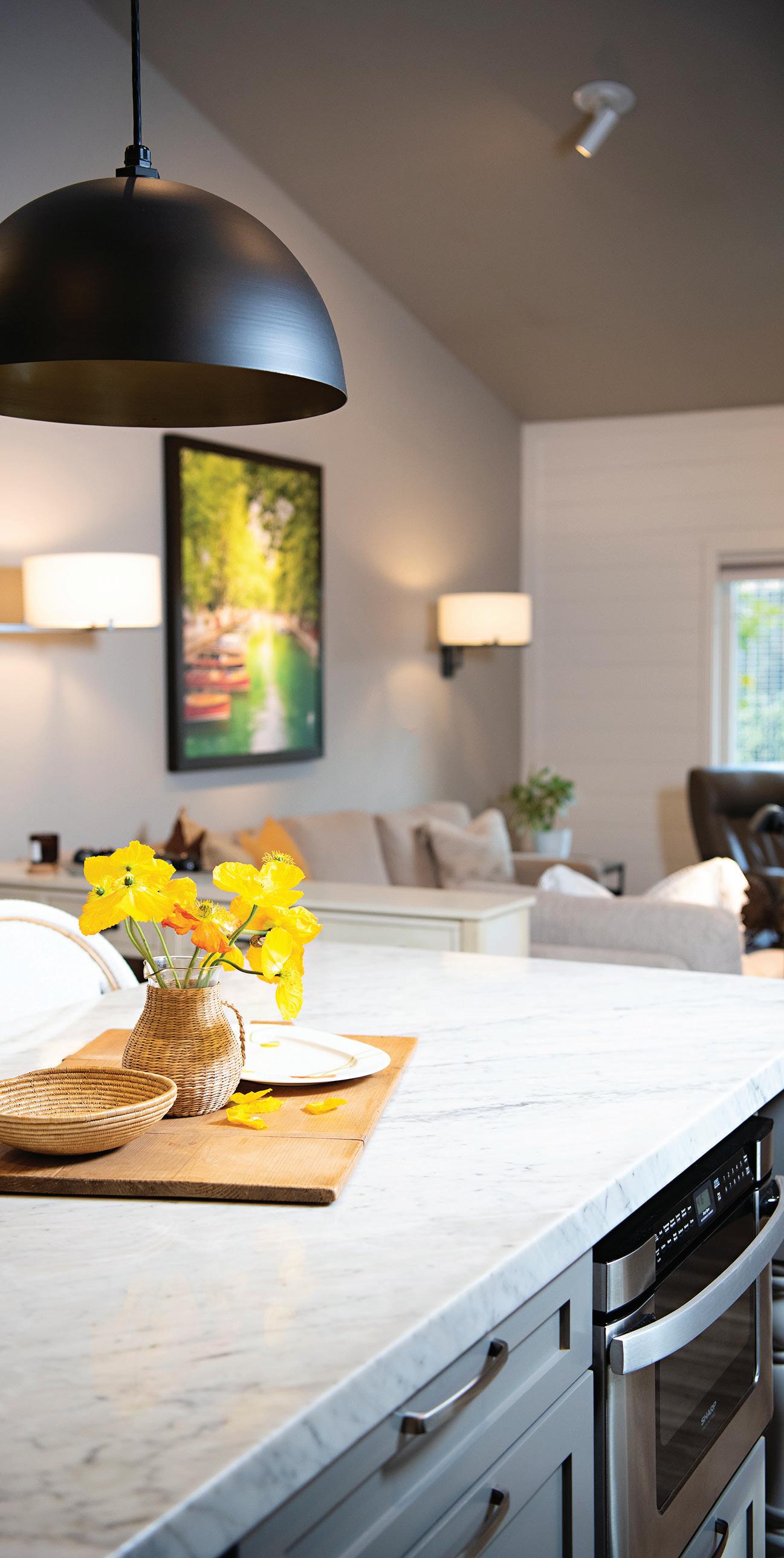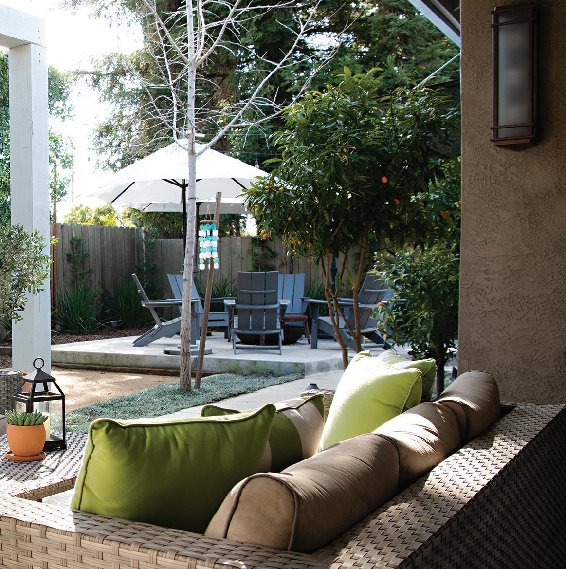 This single-story home was built in the mid-1980s. The homeowners purchased it originally as a rental property, then remodeled it in 2014 to make it their own, commenting, “We love the one level floor plan.” The redesign of the yard by local landscape designer Lee Harris created a welcoming and maintenancefree living space. A bocce ball court, fire pit, and front courtyard have become gathering places for family and friends.