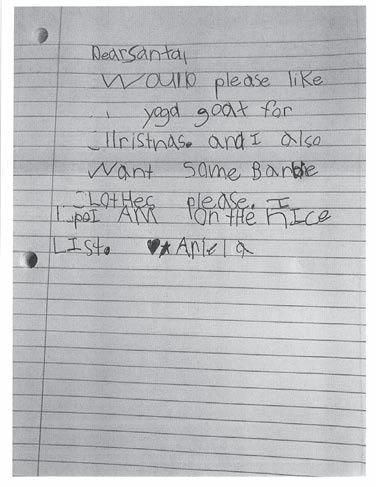 Dear Santa, I would like crayons. Love, Graciela