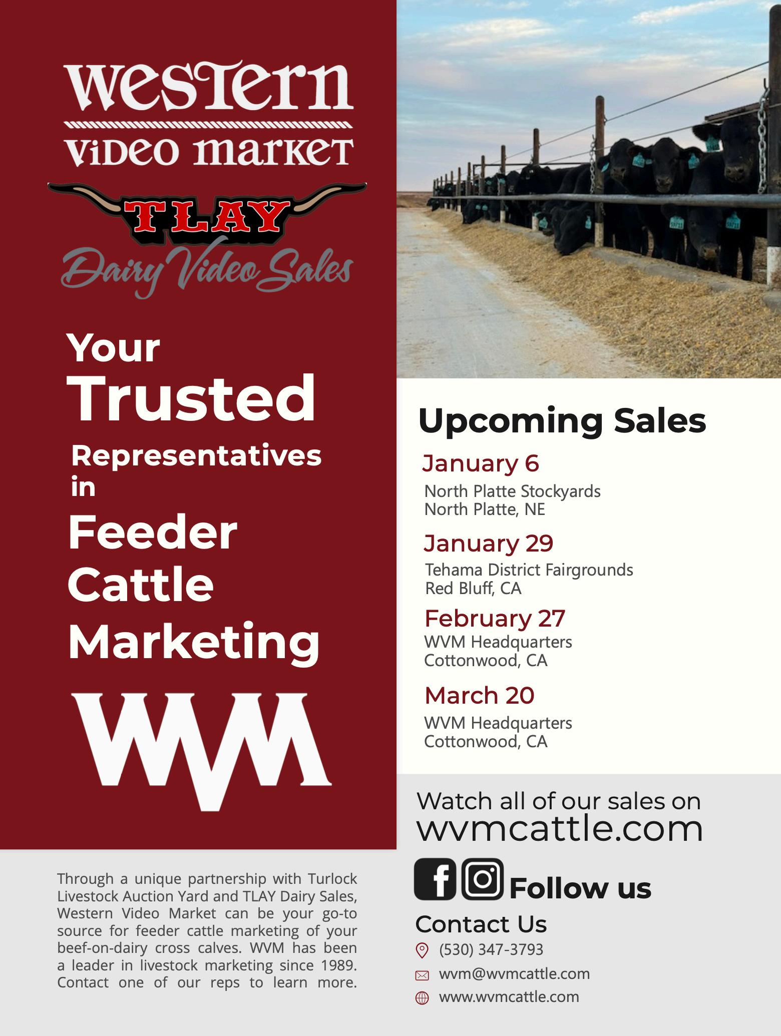 TLAY Dairy Video Sales and Turlock Livestock Auction Yard have partnered with Western Video Market, your premier platform for marketing feeder cattle. This venture is for you, our valued customers. Our combined industry experience allows us to market your beef on dairy cross cattle. Reach out to any one of our representatives to learn more.