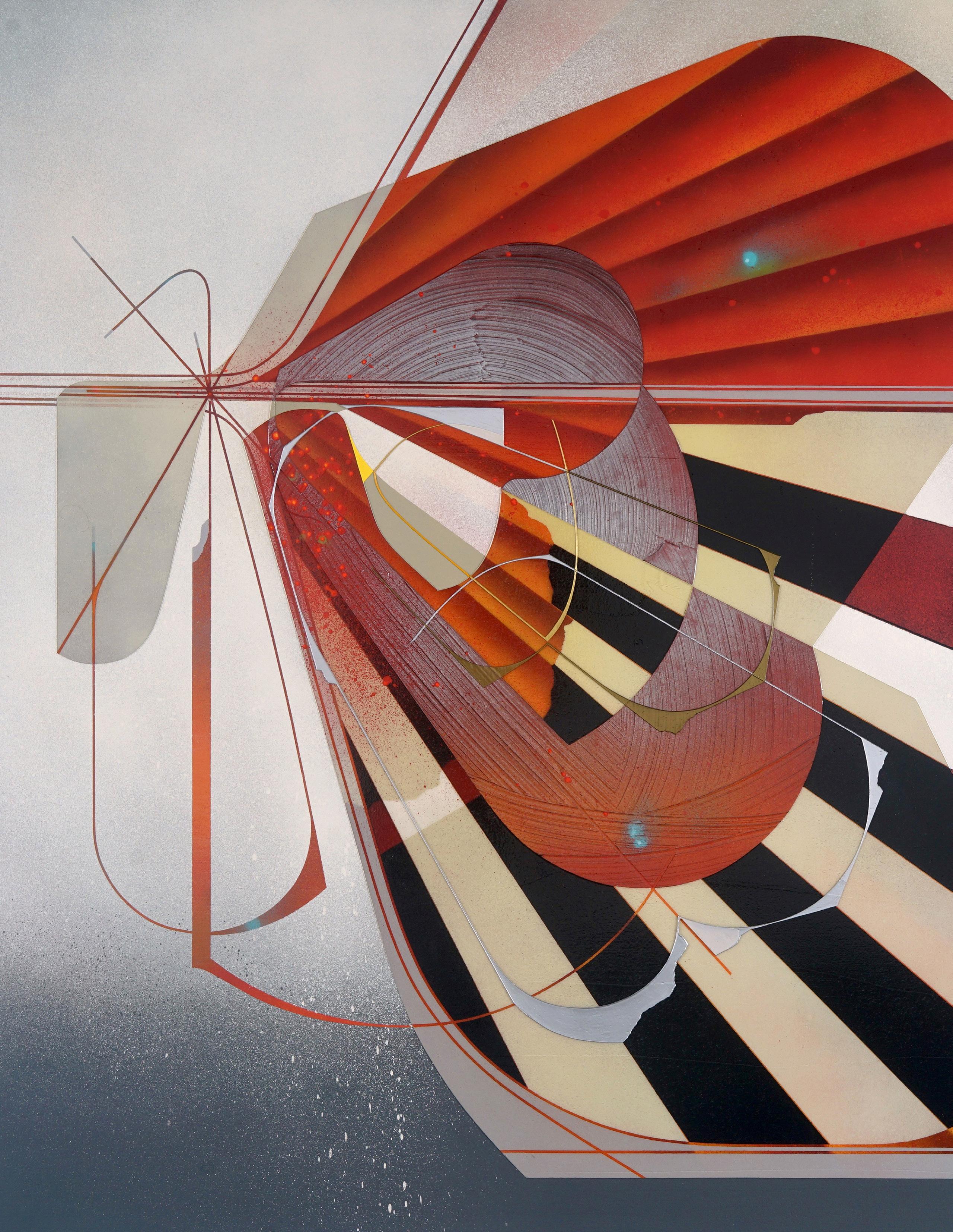 In his latest series, Couwenberg orchestrates an ensemble of color, light, line and texture—each piece a visual improvisation that melds razor- sharp precision with spontaneous intuition. His multilayered canvases pulsate with pearlescent glimmers and atmospheric gradients, where masking, spray techniques and hand - scraped striations reference the sleek contours of ship hulls, car fins and coastal vessels. The forms are in restless motion - shifting, sliding, overlapping - one into the next. Light itself becomes a primary collaborator, dancing across surfaces in harmonic counterpoint to geometric forms and interrupted gridlines.