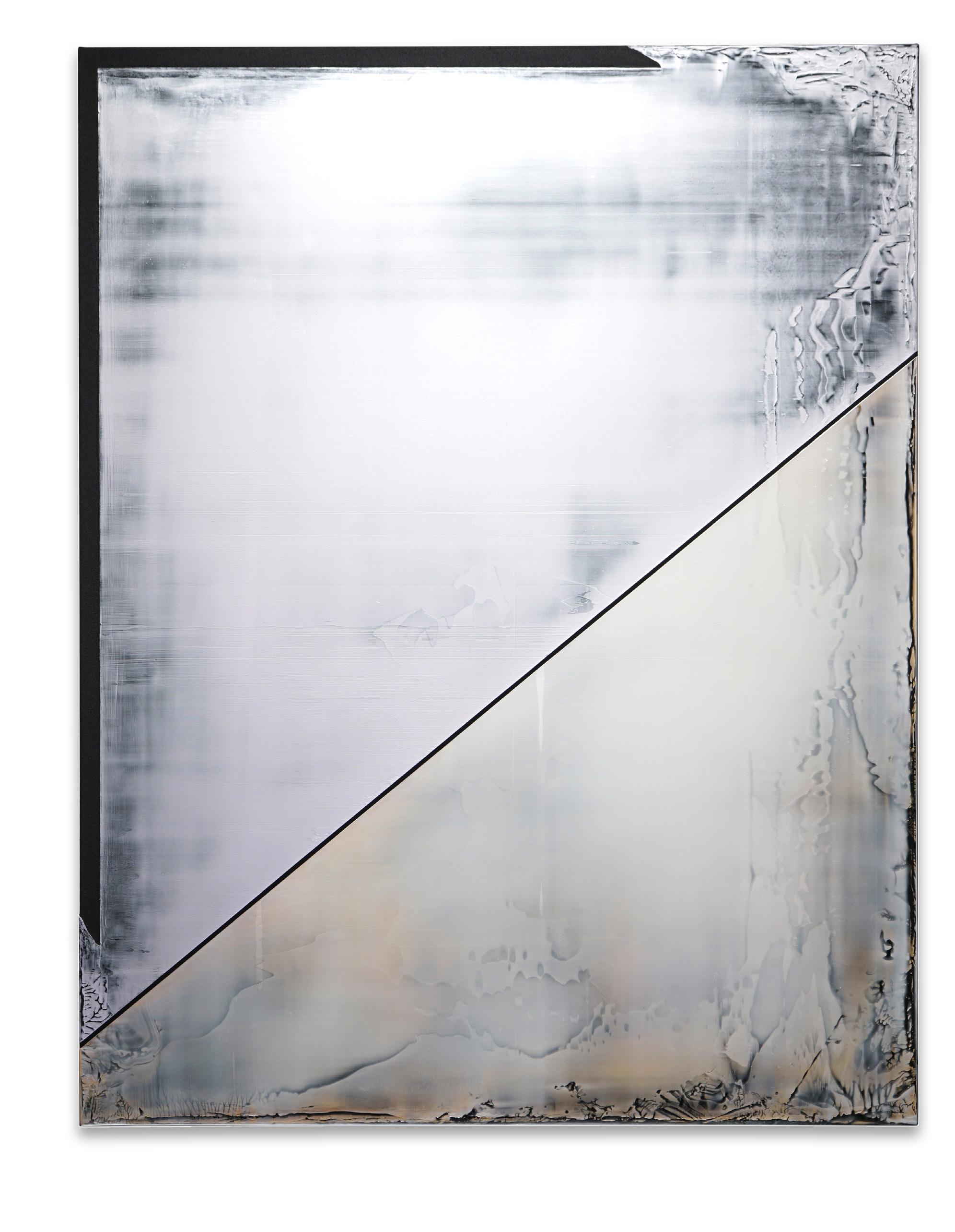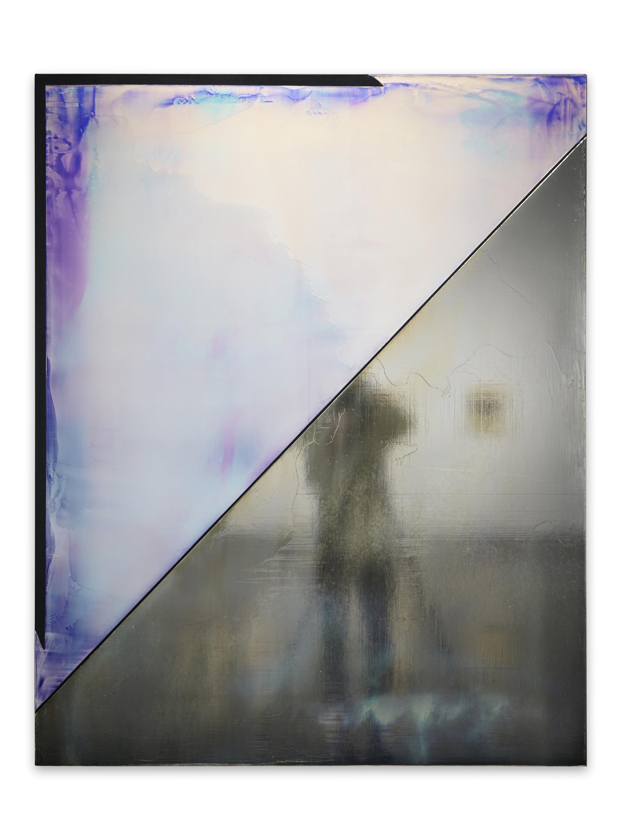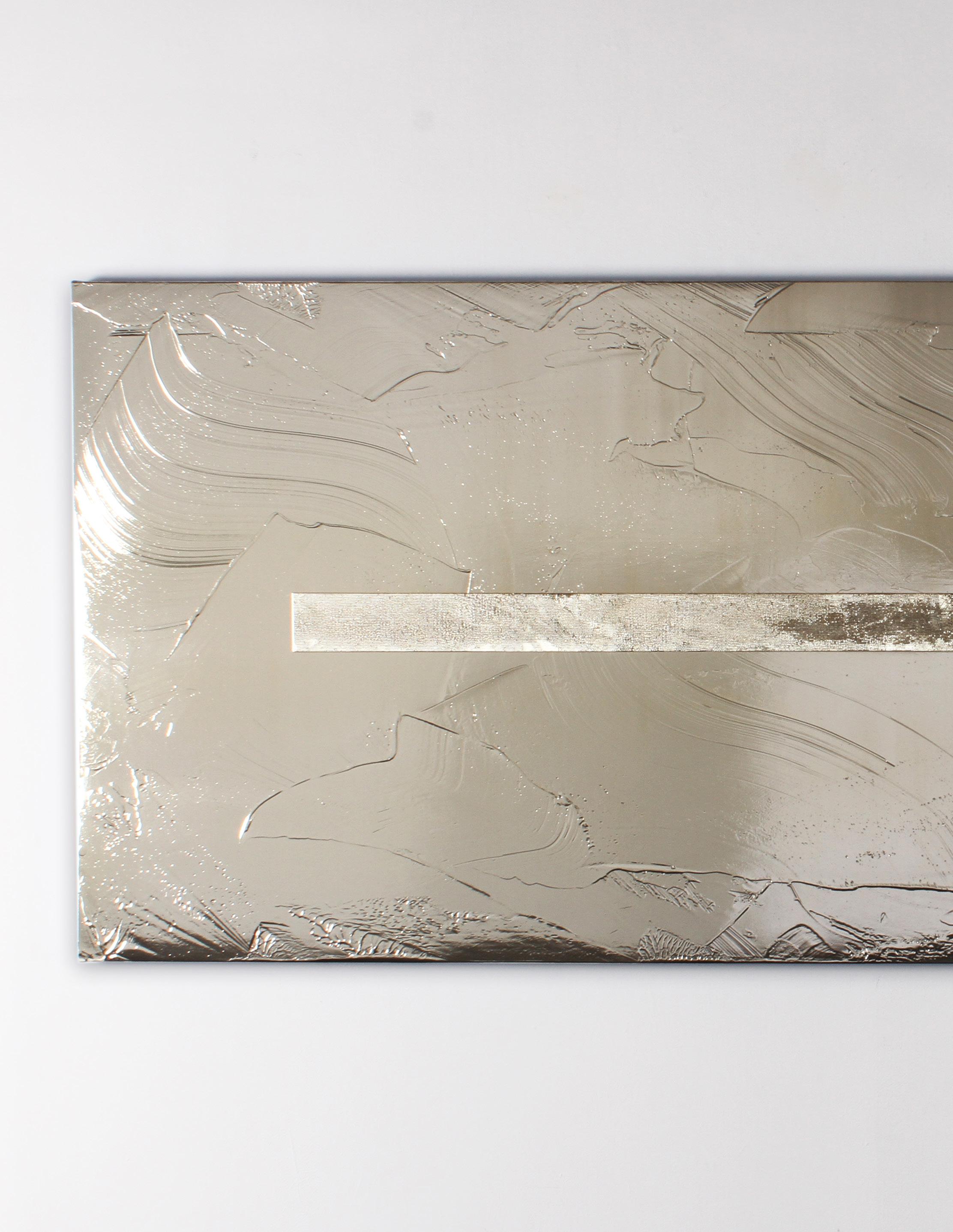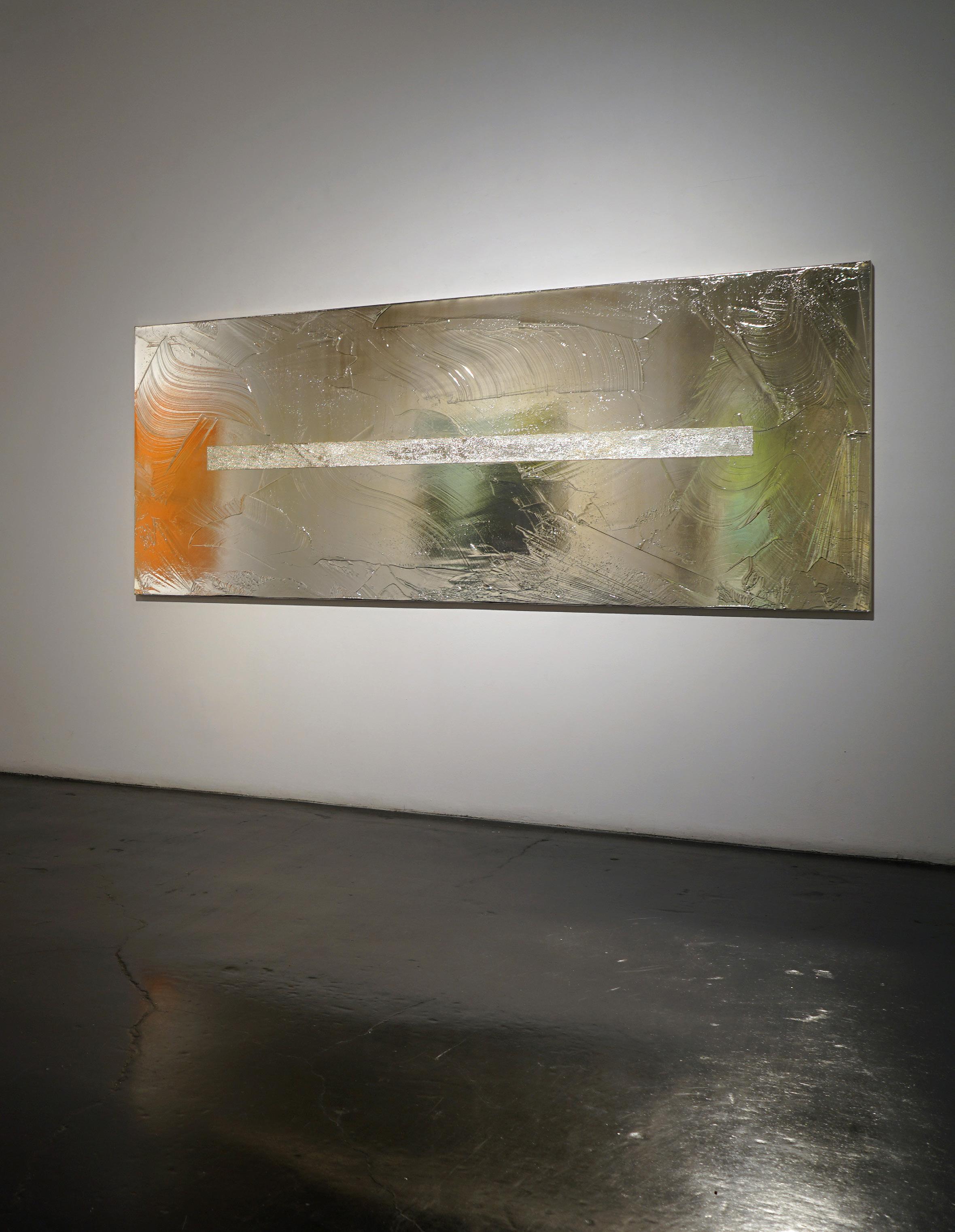 Casper Brindle creates paintings and sculptures that engage light through reflective, industrial materials including resin and automotive paint. His work shifts with the viewer’s movement, emphasizing perception and atmospheric depth.