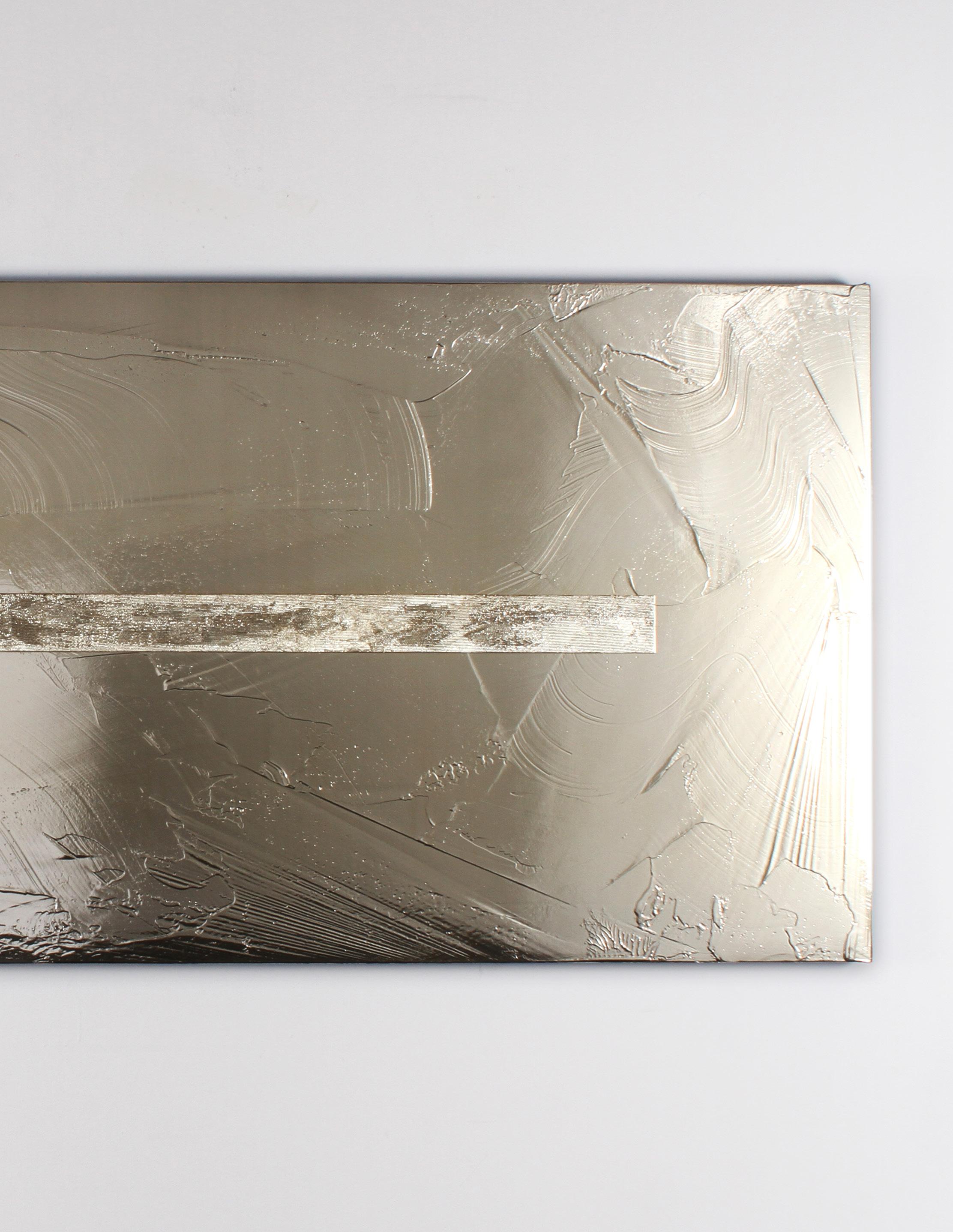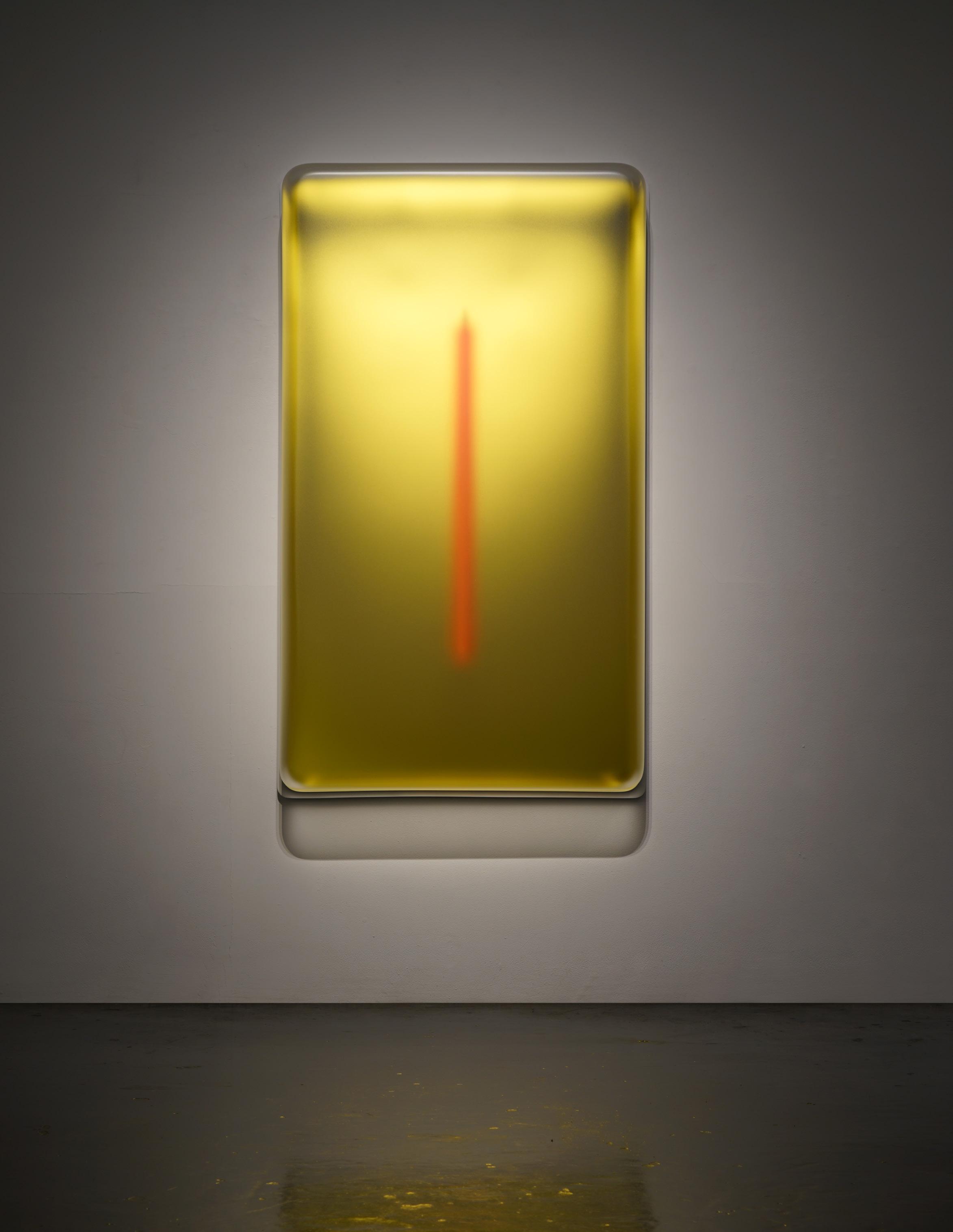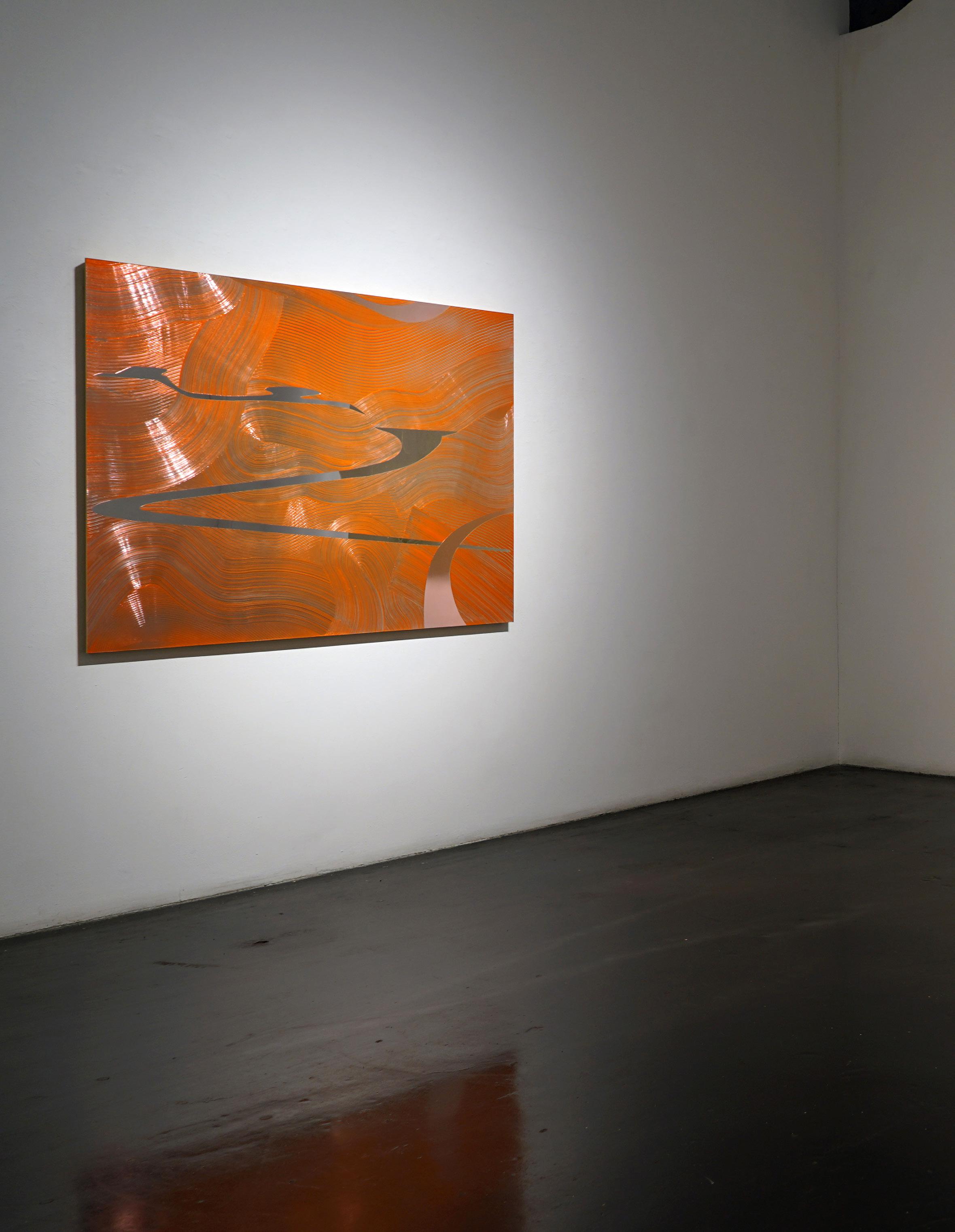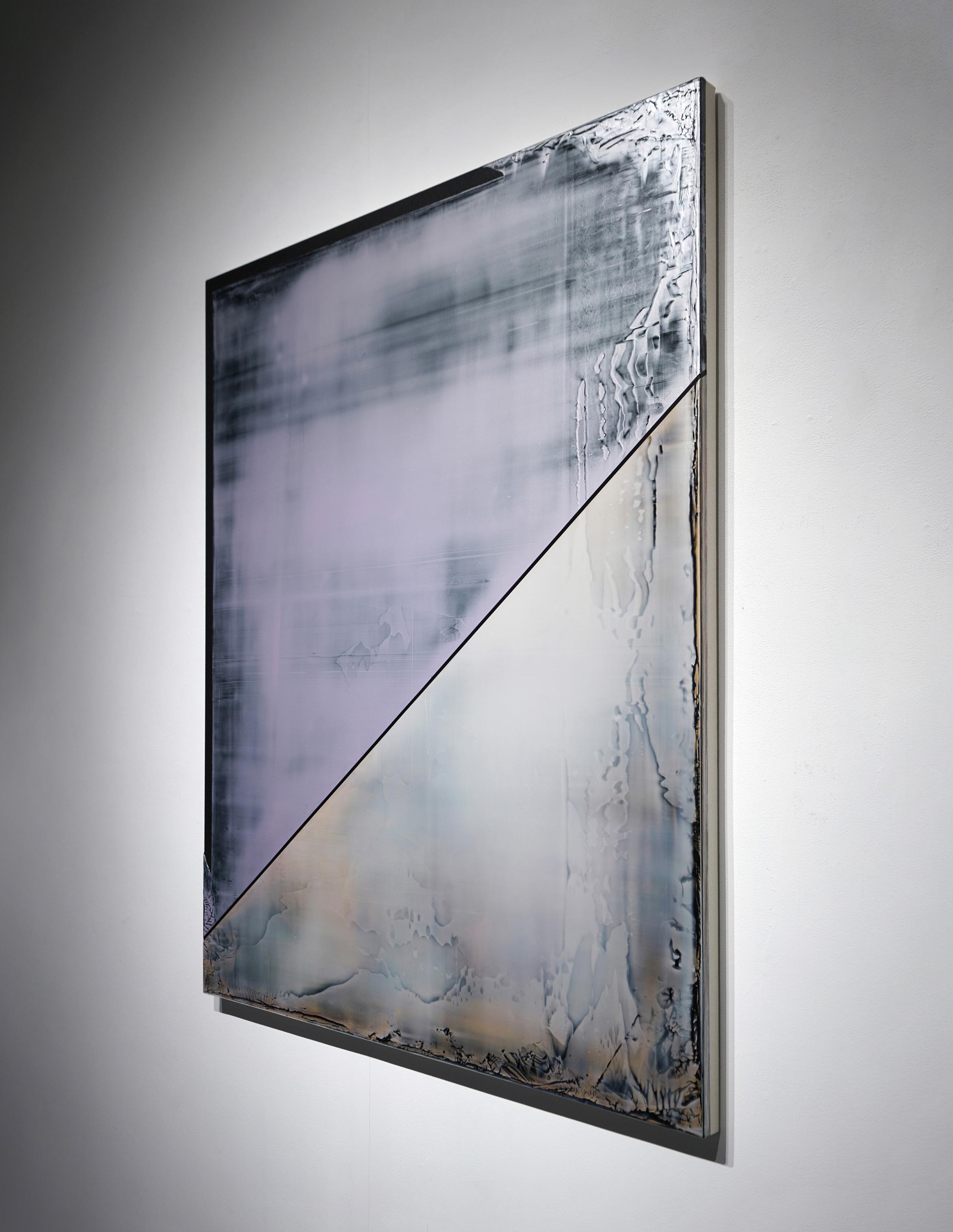Casper Brindle creates paintings and sculptures that engage light through reflective, industrial materials including resin and automotive paint. His work shifts with the viewer’s movement, emphasizing perception and atmospheric depth.