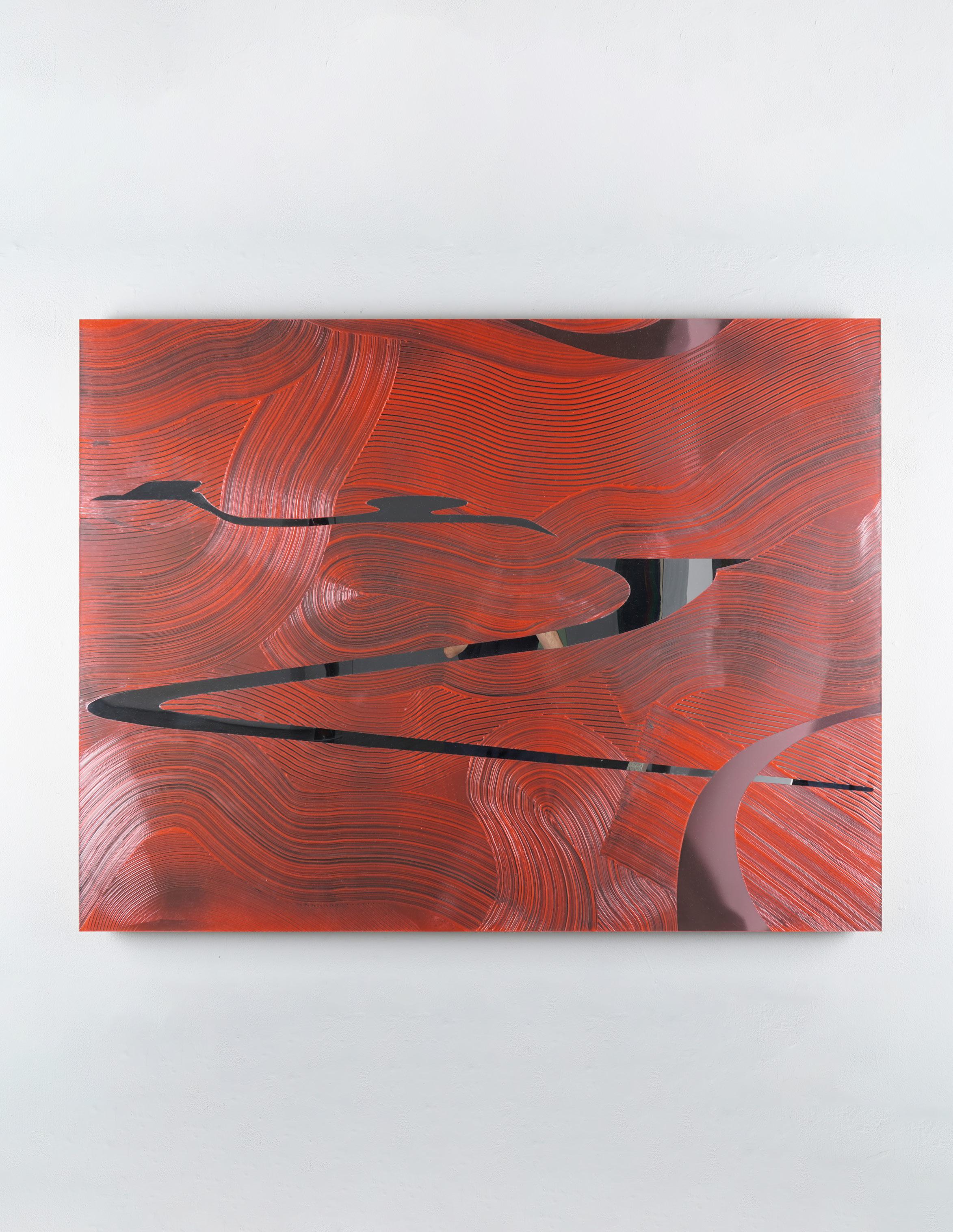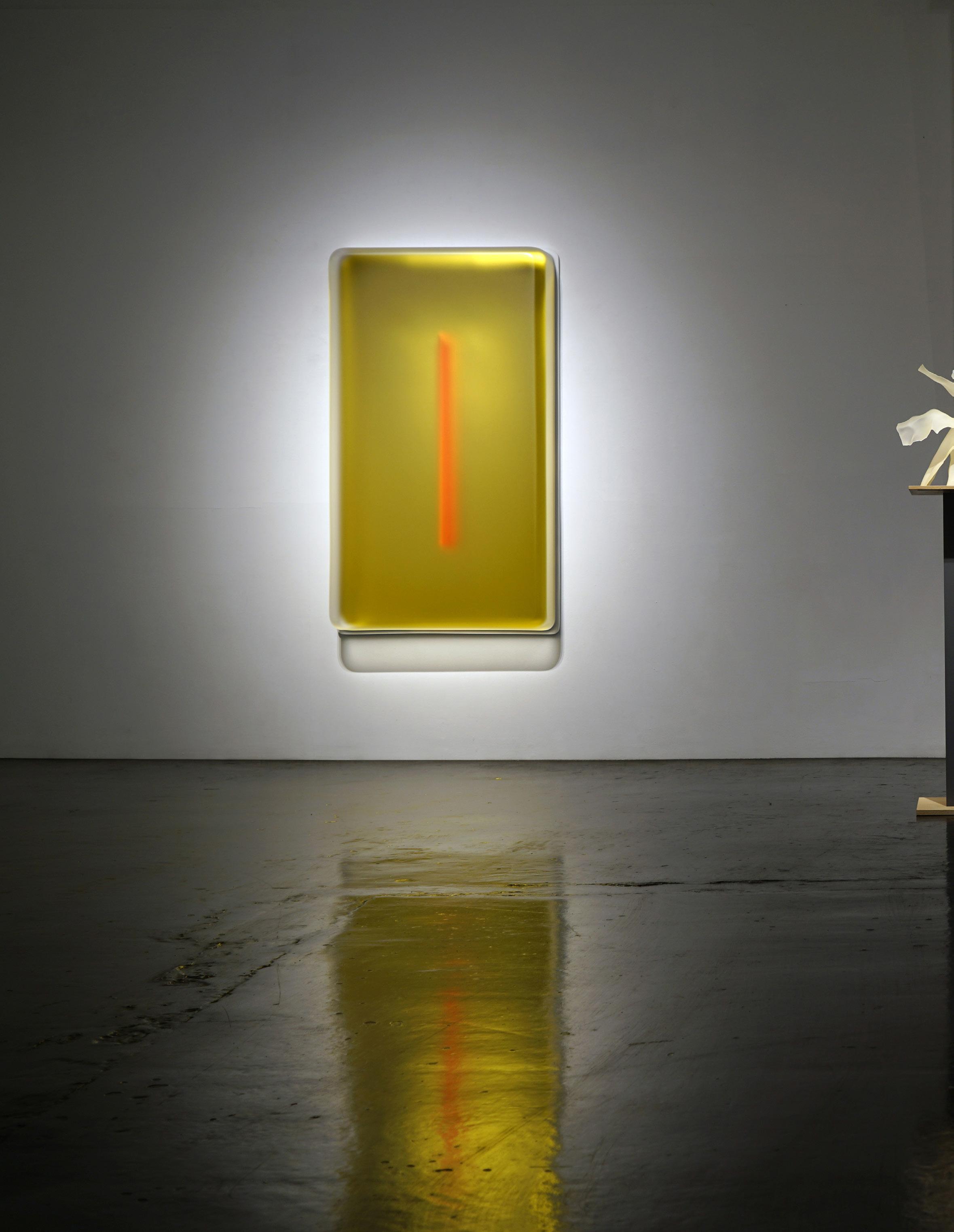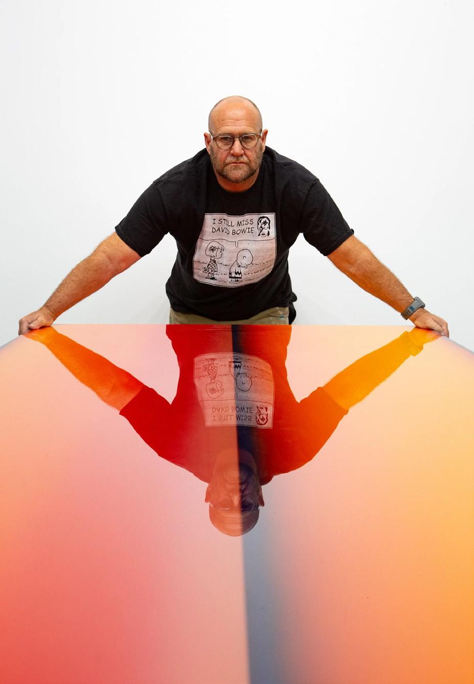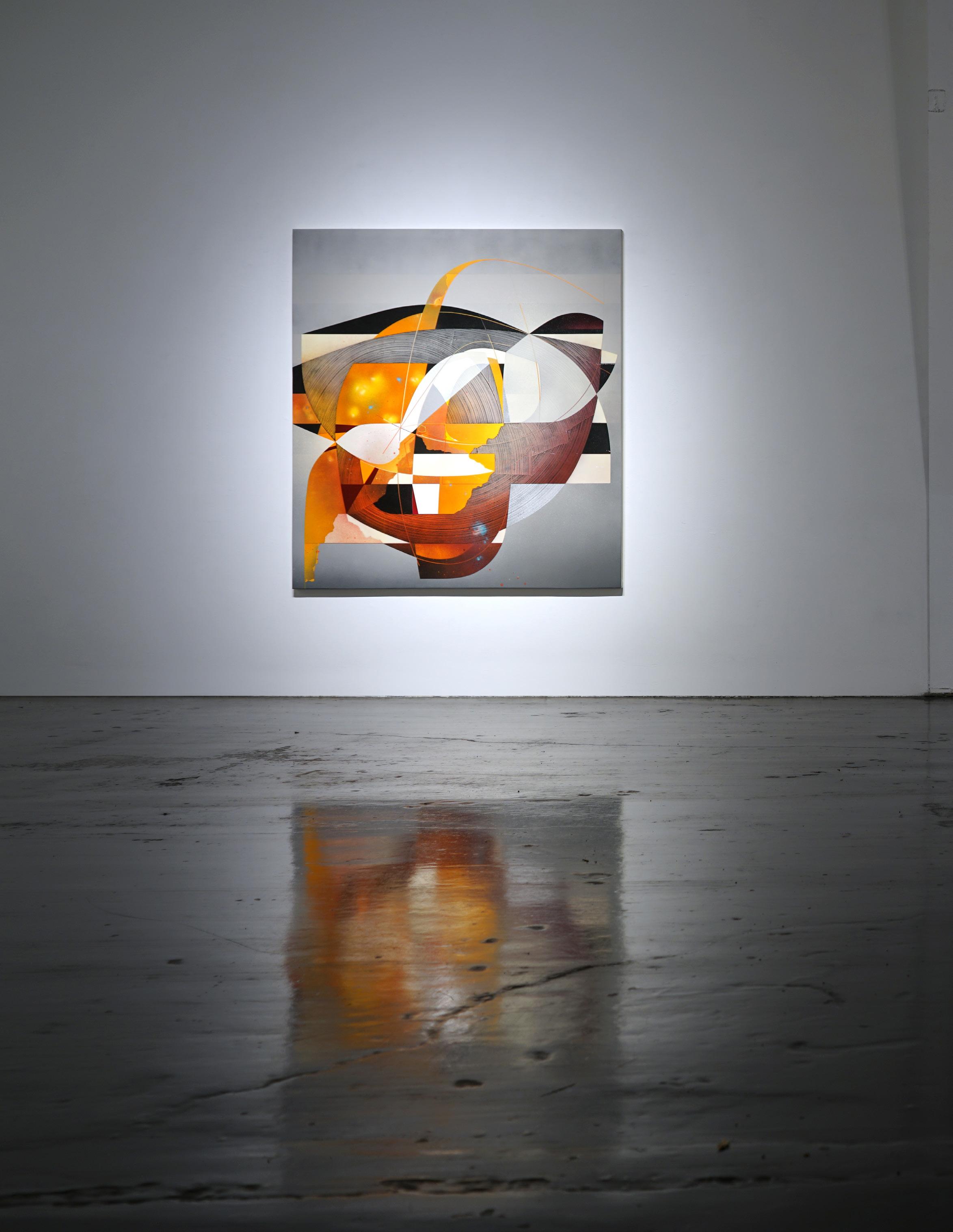 Casper Brindle creates paintings and sculptures that engage light through reflective, industrial materials including resin and automotive paint. His work shifts with the viewer’s movement, emphasizing perception and atmospheric depth.