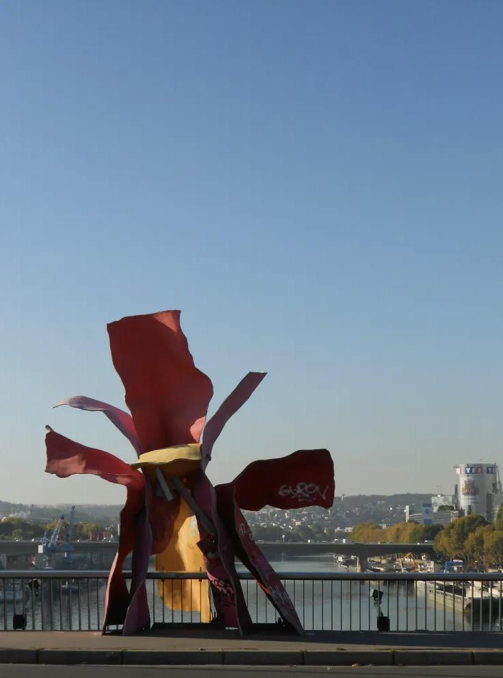 The sculpture Memory of Sophie Calle’s Flower (2012), included in Surface Tension, offers a particularly clear example of this overlap between sculpture and architecture. The work originates in Gehry’s 2006 collaboration with the French artist Sophie Calle, entitled, Le Téléphone, a flower-like public sculpture, installed on the Pont du Garigliano in Paris. Functioning as a telephone booth, passersby received spontaneous calls from Calle if they answered the phone, turning architecture into a site of performance, exchange, and lived experience.