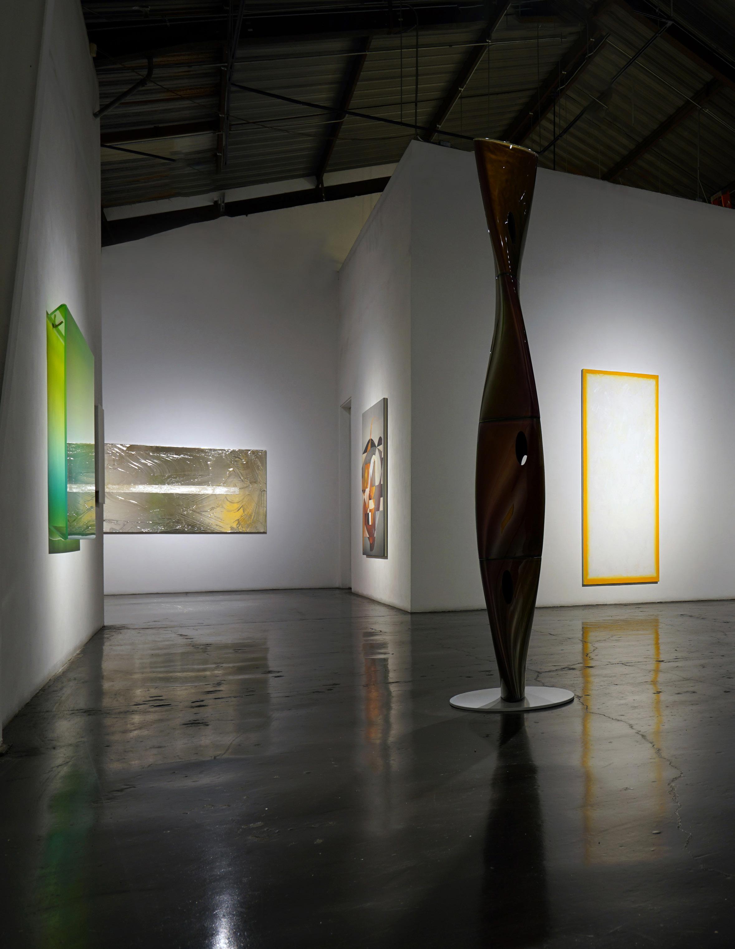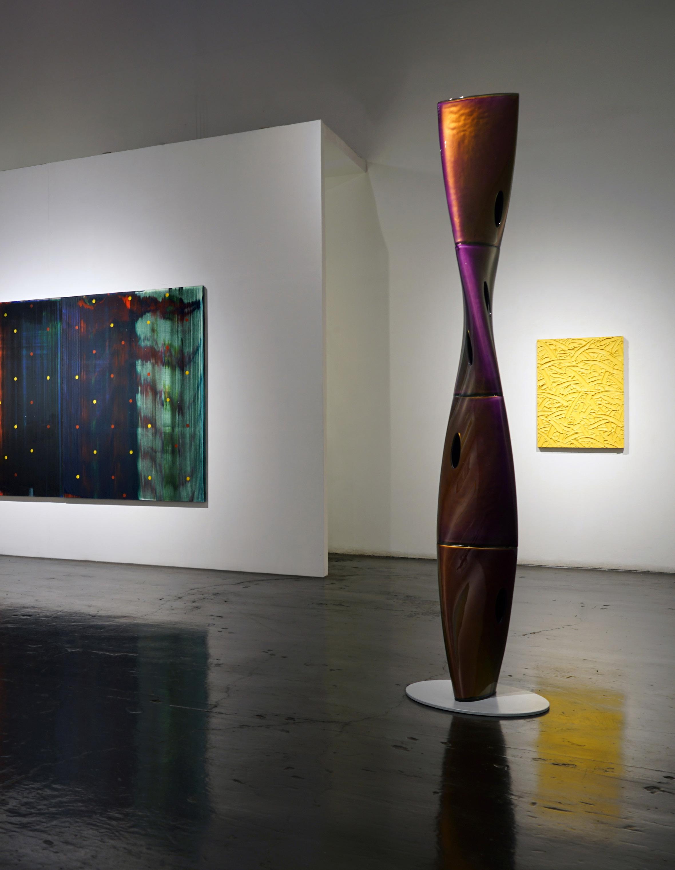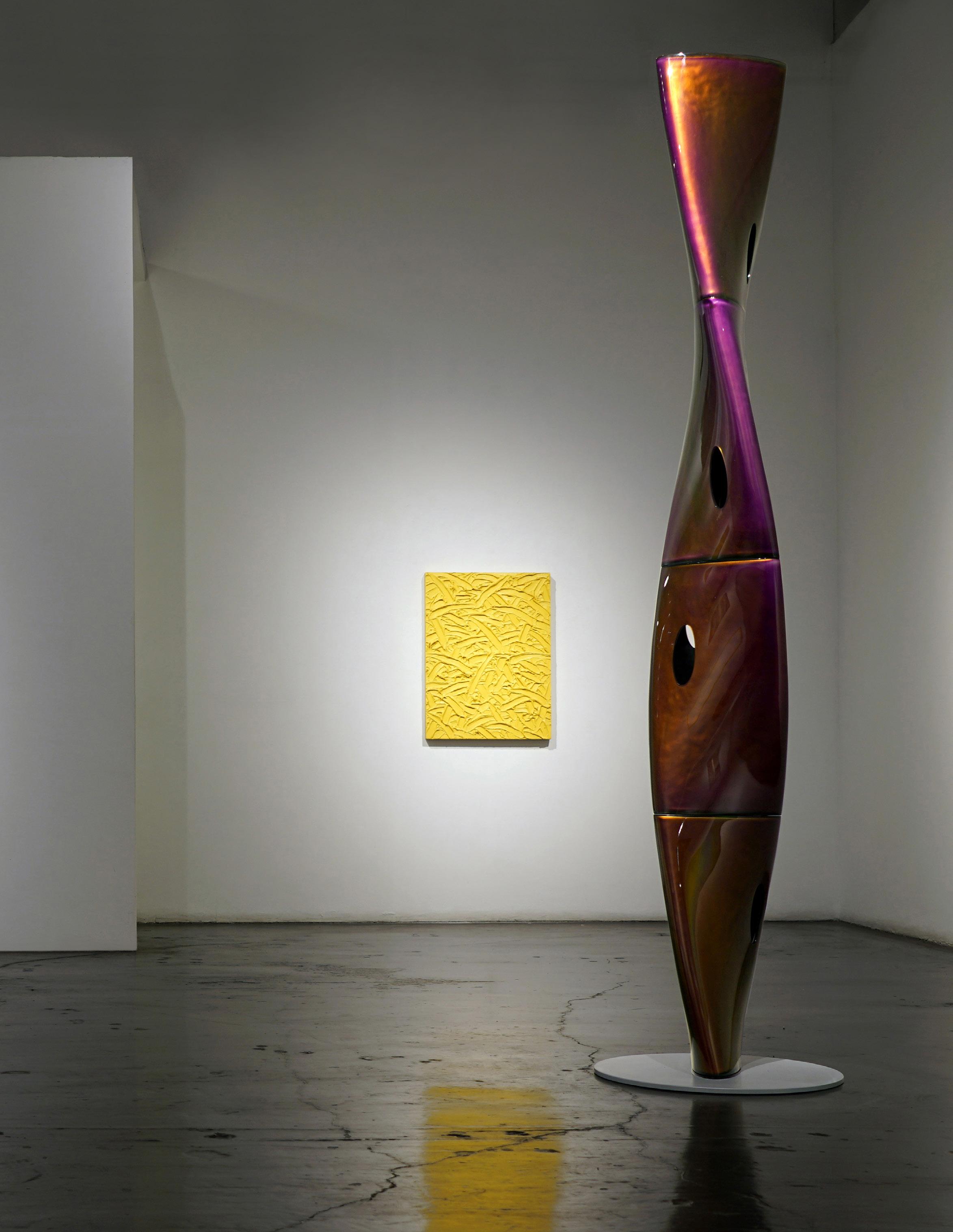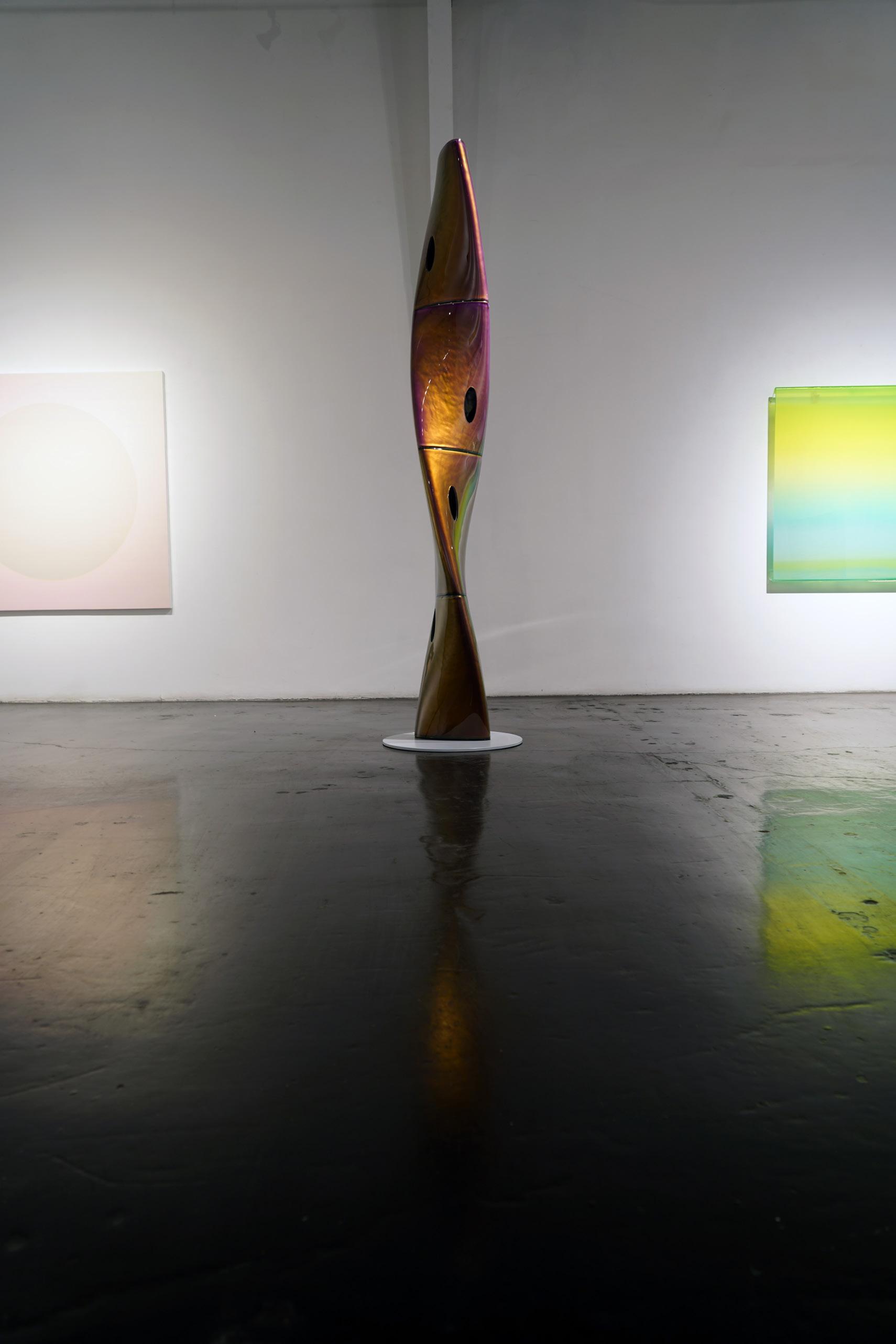 At the nexus of the L.A. art scene for nearly forty years, Eric Johnson’s work bears a distinctly Southern California hot-rod, materials-based aesthetic. Early on, Johnson was drawn to artists whose work also grew out of L.A.’s surf and car culture sensibilities. Utilizing new materials and industrial products, like resin & plastic, artwork of impossibly slick, sleek character began to emerge and was termed “Finish Fetish”. Johnson’s work is next generation heir to this work, and carries forward the DNA of such legendary Light and Space, Finish Fetish, artists as Craig Kaufman, DeWain Valentine, Billy Al Bengston, Larry Bell, Tom Jenkins and Tony DeLap.