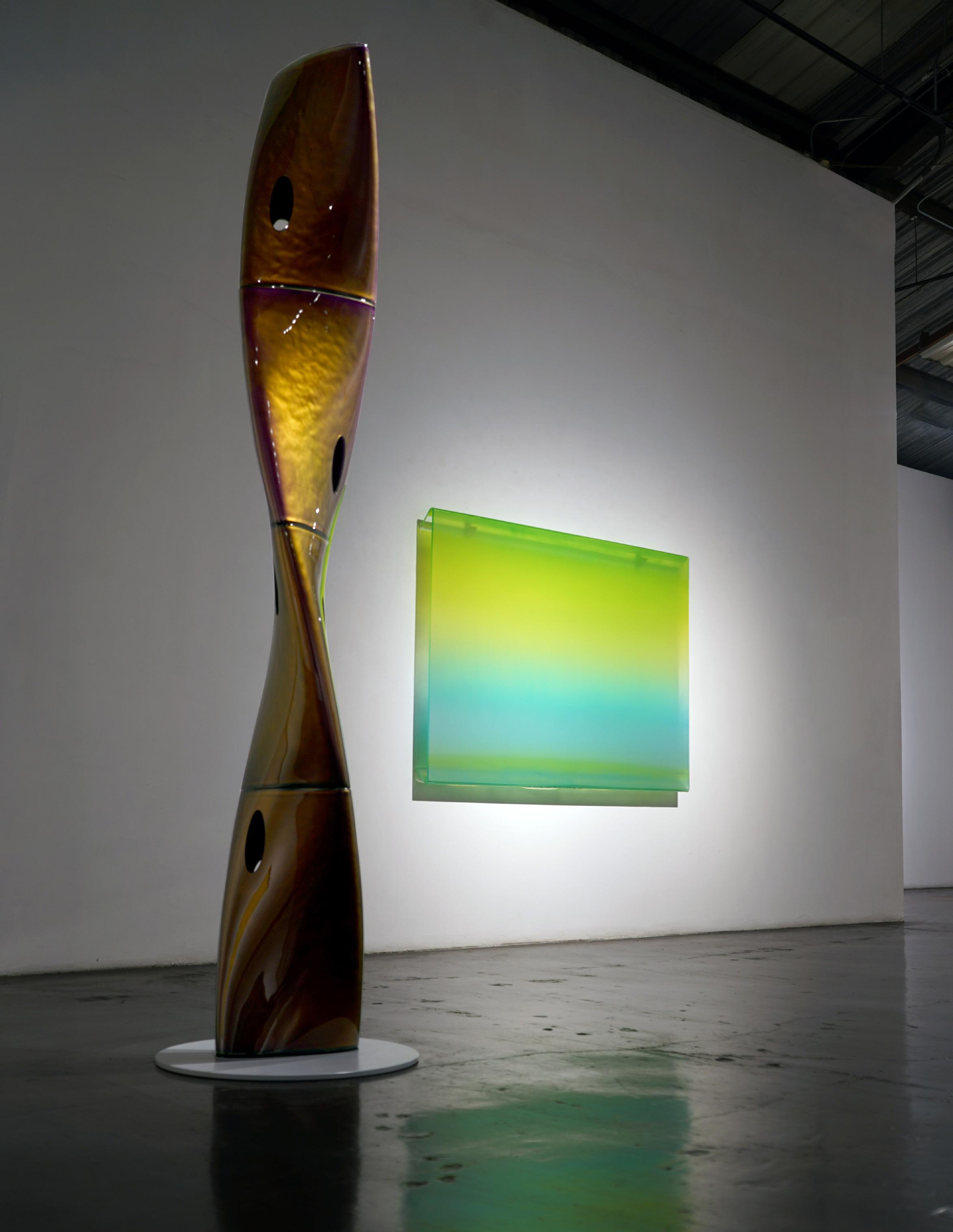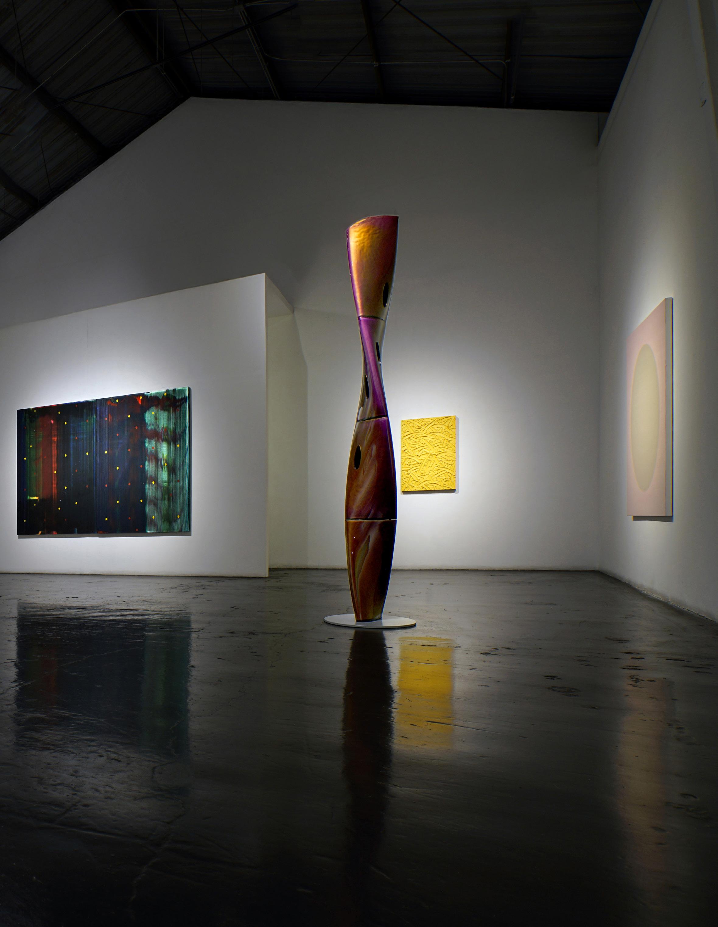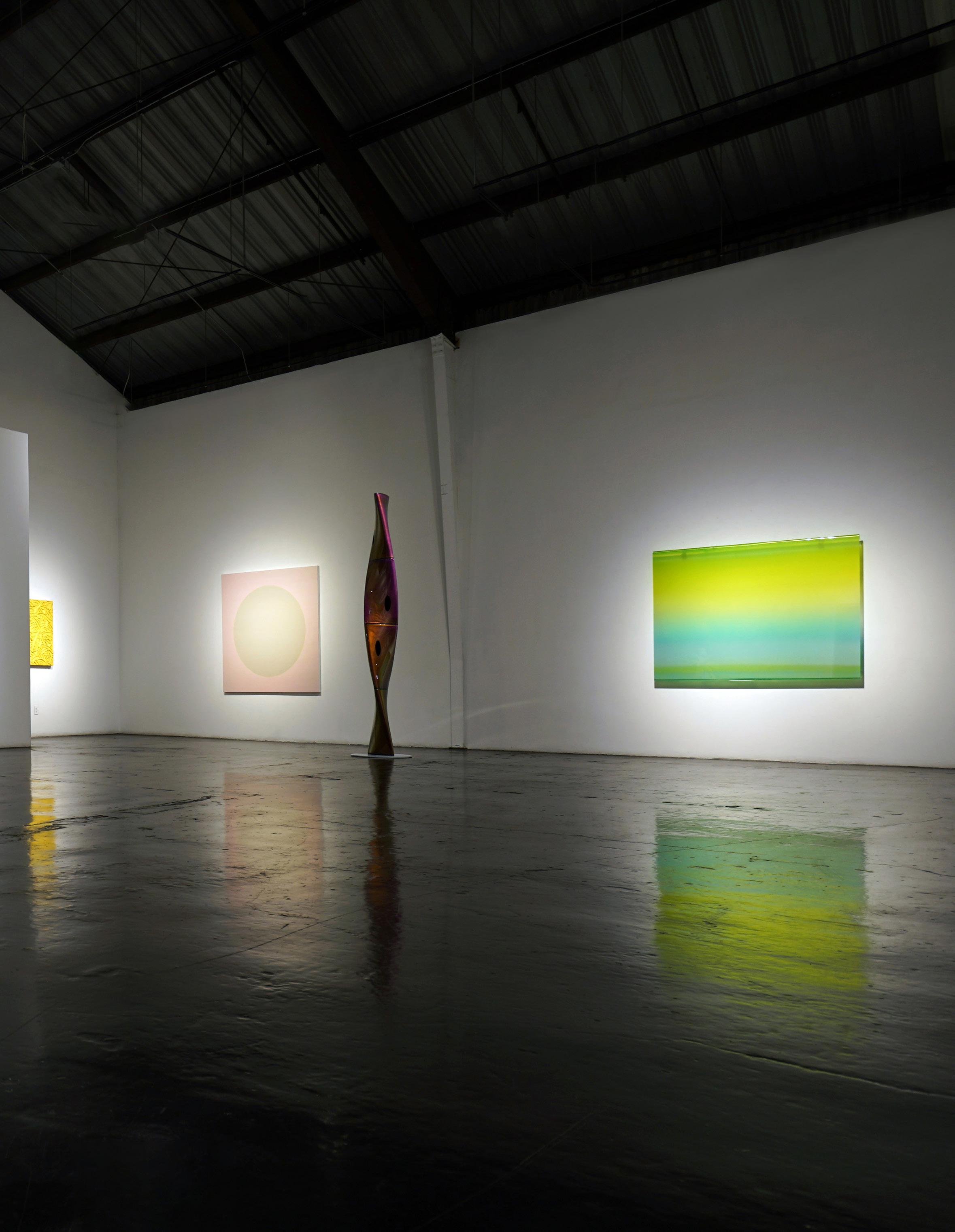 At the nexus of the L.A. art scene for nearly forty years, Eric Johnson’s work bears a distinctly Southern California hot-rod, materials-based aesthetic. Early on, Johnson was drawn to artists whose work also grew out of L.A.’s surf and car culture sensibilities. Utilizing new materials and industrial products, like resin & plastic, artwork of impossibly slick, sleek character began to emerge and was termed “Finish Fetish”. Johnson’s work is next generation heir to this work, and carries forward the DNA of such legendary Light and Space, Finish Fetish, artists as Craig Kaufman, DeWain Valentine, Billy Al Bengston, Larry Bell, Tom Jenkins and Tony DeLap.