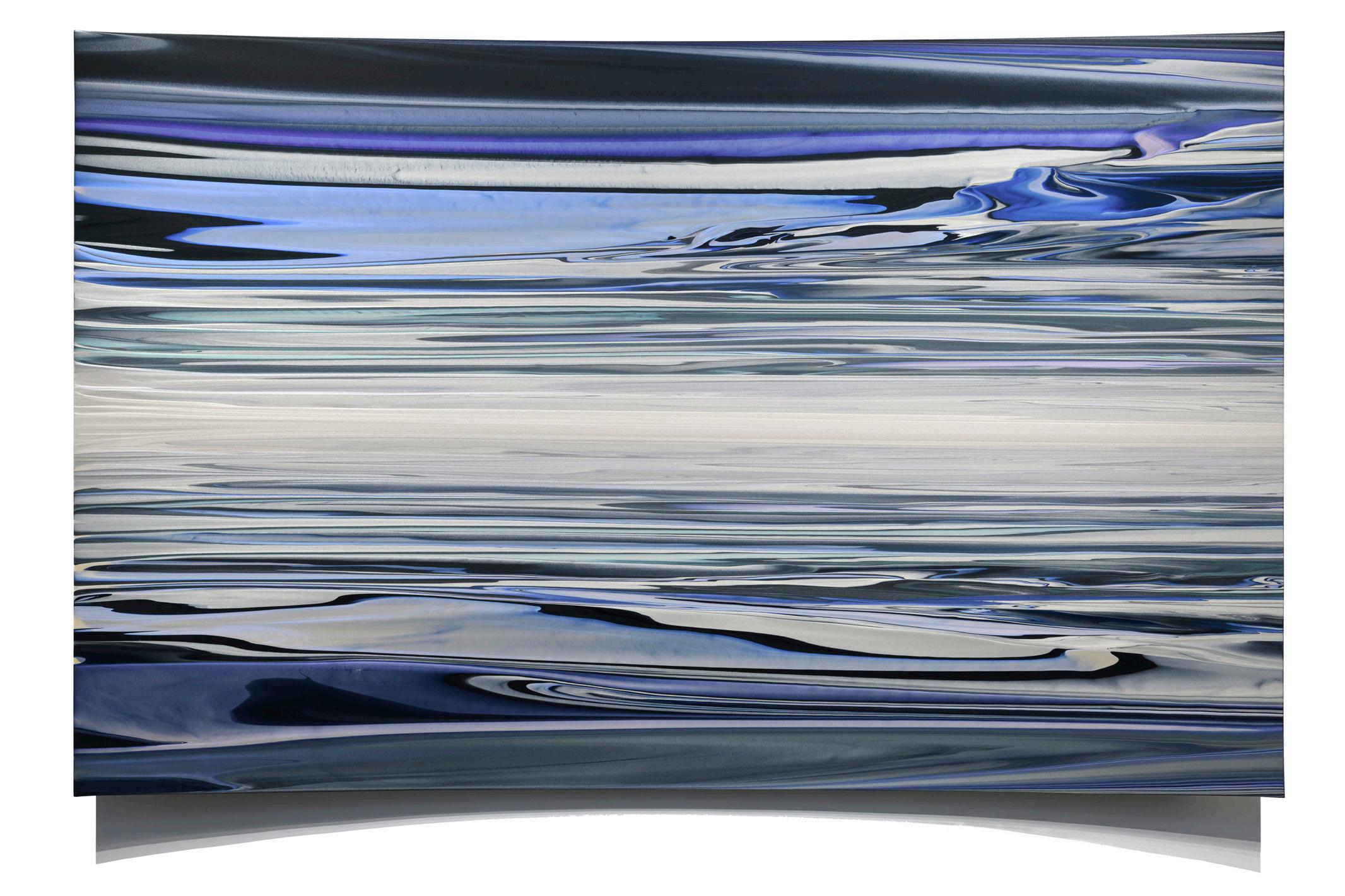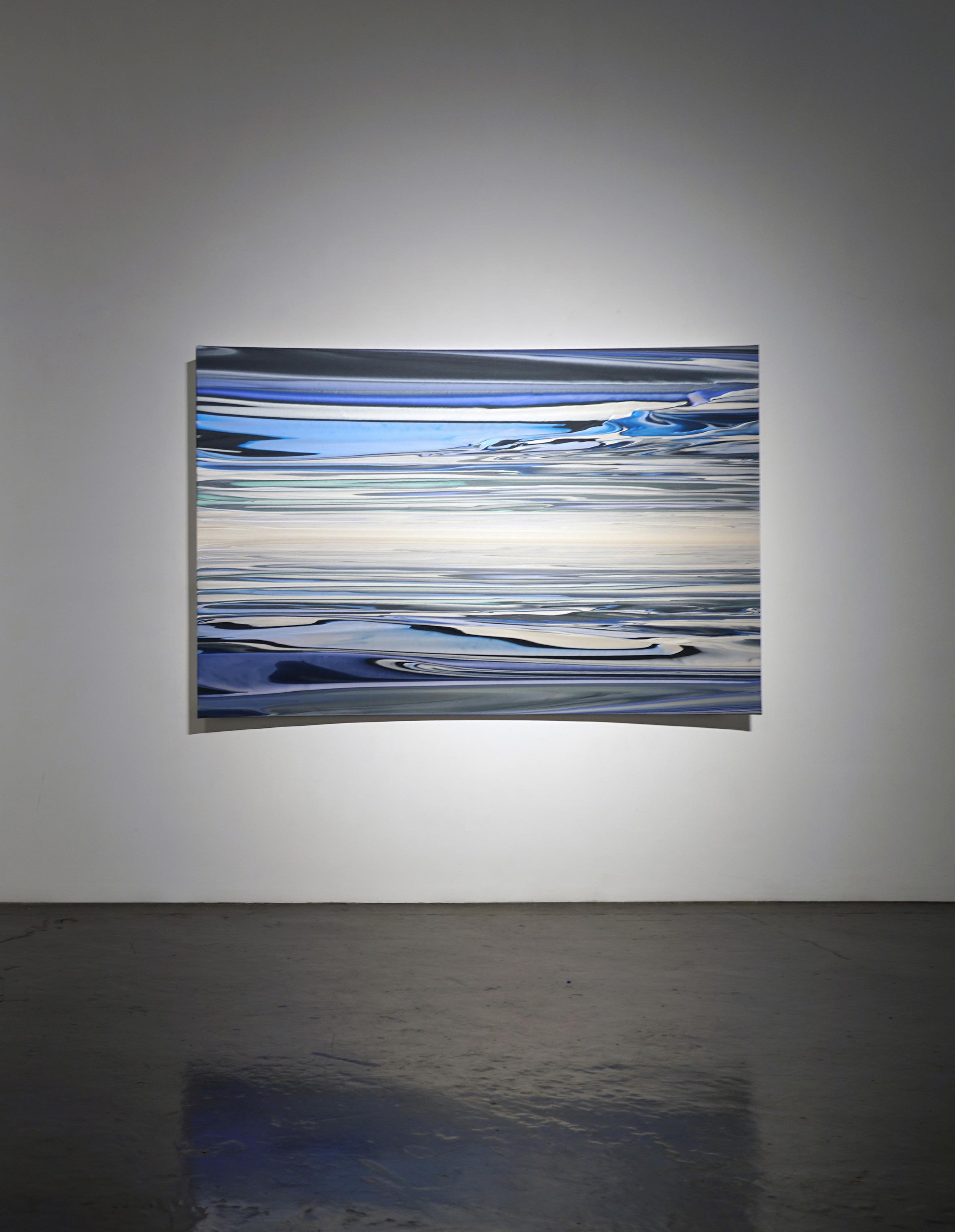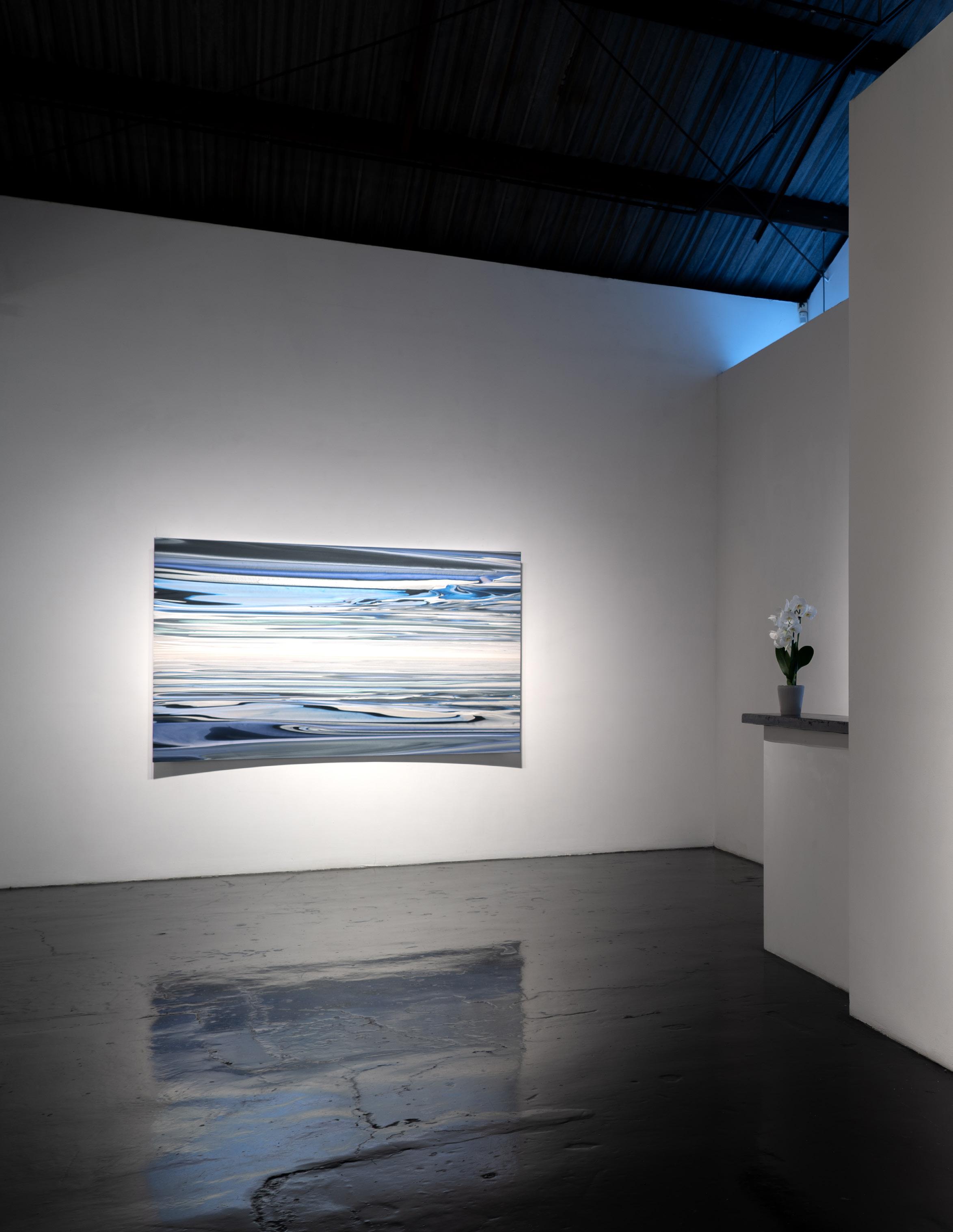 After eighteen years in New York, Moses returned to Southern California in 2000, where the change in coasts led to a significant shift in his work. In New York, the artist’s work had explored the influences of nature, conveying a sense of gravitational and geologic forces. In returning to California, the scope of Moses’s work expanded, as he was once again inspired by the unique effects of light glancing off waves, and the vast sky-scapes he encountered on his daily drive down the Pacific Coast Highway. The artist began exploring materials that would capture the mercurial aspects of perception, where slight shifts in perspective would reveal dramatic shifts in impression. Accordingly, Moses’ work began to incorporate many of the qualities now associated with the Southern California Light and Space movement, where the work of art became less an “art object”, and more of a “catalyst” for one’s experience of what and how they are perceived. Suggesting panoramic space, Moses began introducing concave and shaped panels to further investigate how light and its wave-lengths would curl and flex with refractive paints. These bold new paintings quickly found their audience and brought Moses to the attention of museums and major collectors alike.