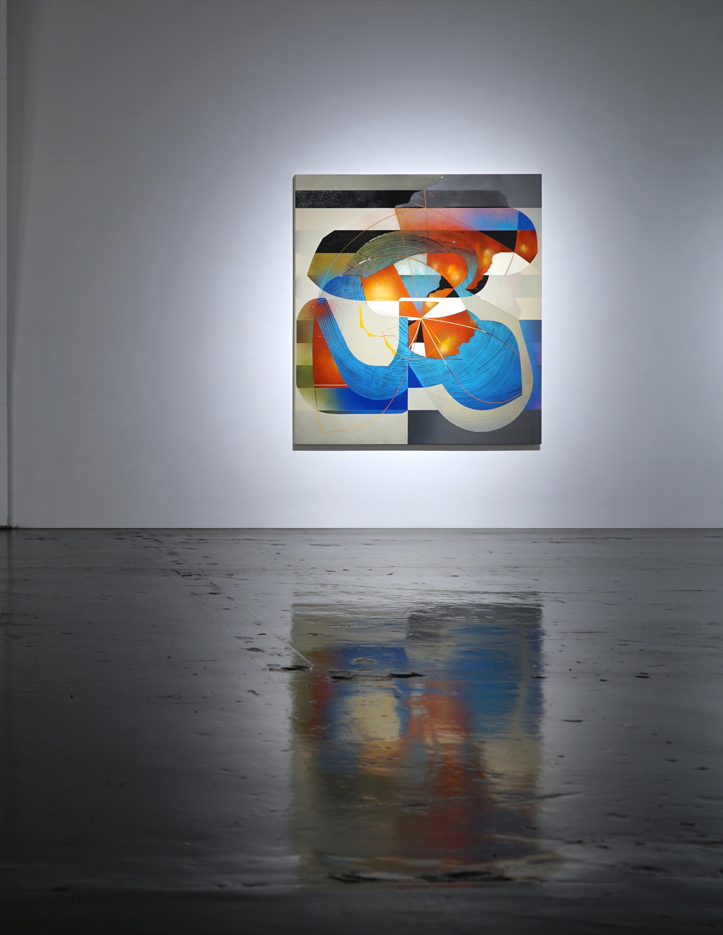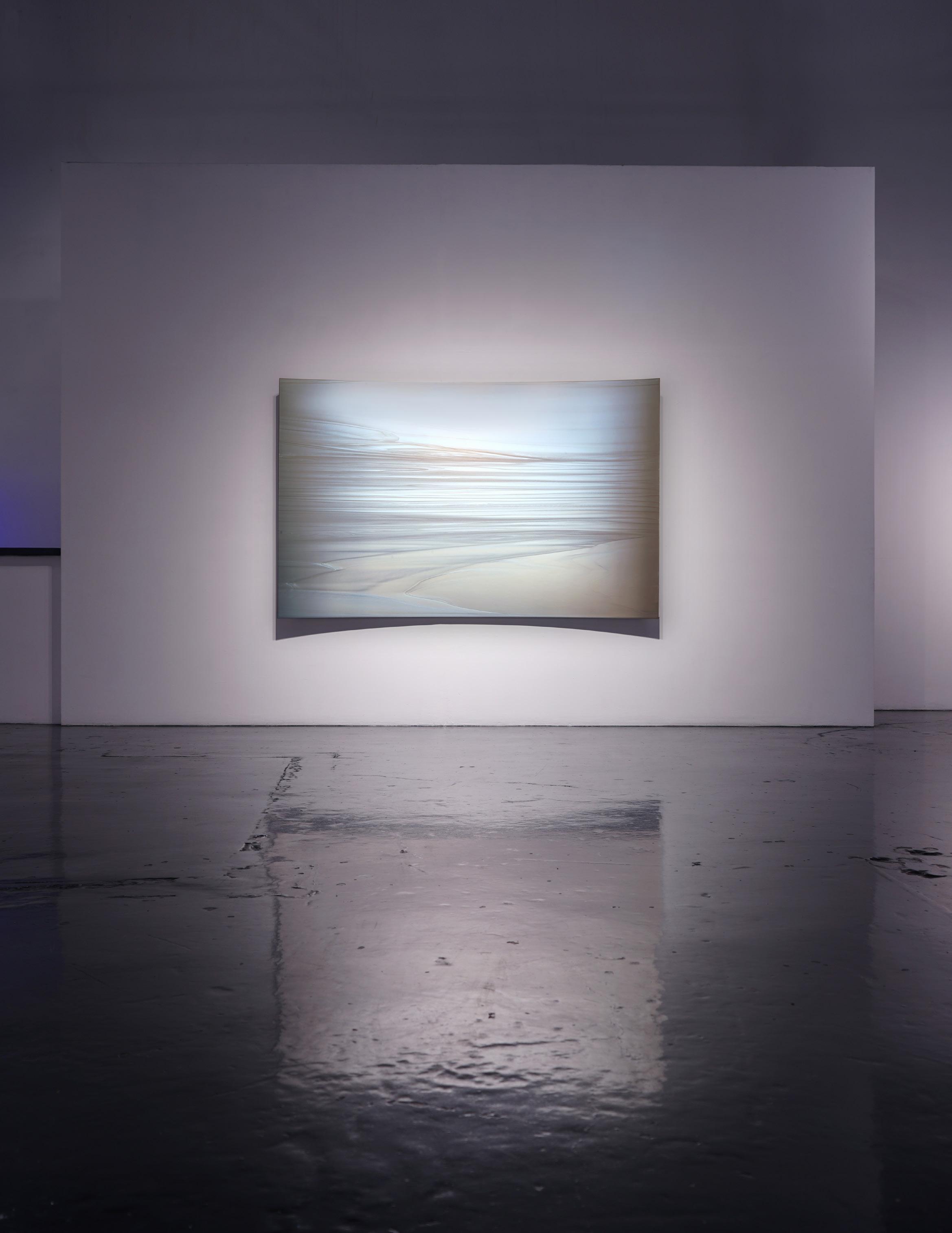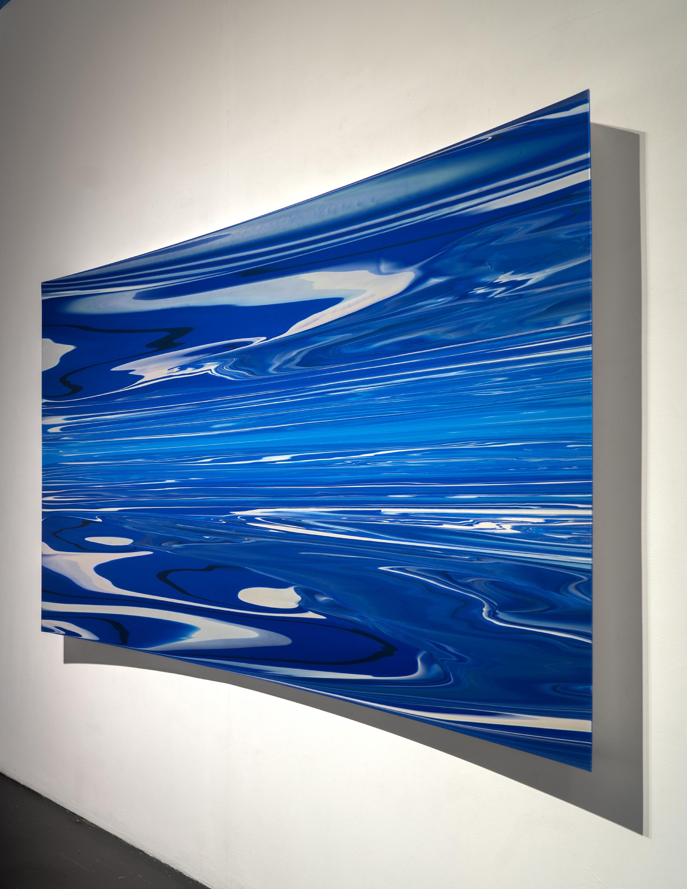 After eighteen years in New York, Moses returned to Southern California in 2000, where the change in coasts led to a significant shift in his work. In New York, the artist’s work had explored the influences of nature, conveying a sense of gravitational and geologic forces. In returning to California, the scope of Moses’s work expanded, as he was once again inspired by the unique effects of light glancing off waves, and the vast sky-scapes he encountered on his daily drive down the Pacific Coast Highway. The artist began exploring materials that would capture the mercurial aspects of perception, where slight shifts in perspective would reveal dramatic shifts in impression. Accordingly, Moses’ work began to incorporate many of the qualities now associated with the Southern California Light and Space movement, where the work of art became less an “art object”, and more of a “catalyst” for one’s experience of what and how they are perceived. Suggesting panoramic space, Moses began introducing concave and shaped panels to further investigate how light and its wave-lengths would curl and flex with refractive paints. These bold new paintings quickly found their audience and brought Moses to the attention of museums and major collectors alike.