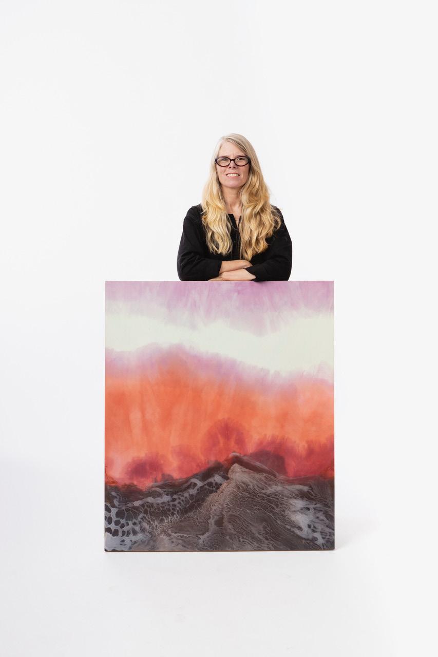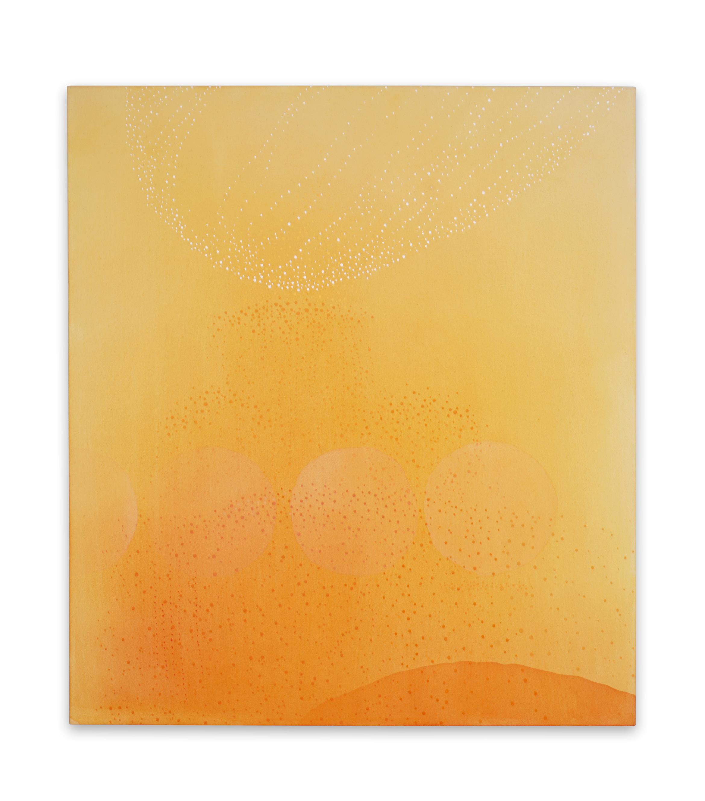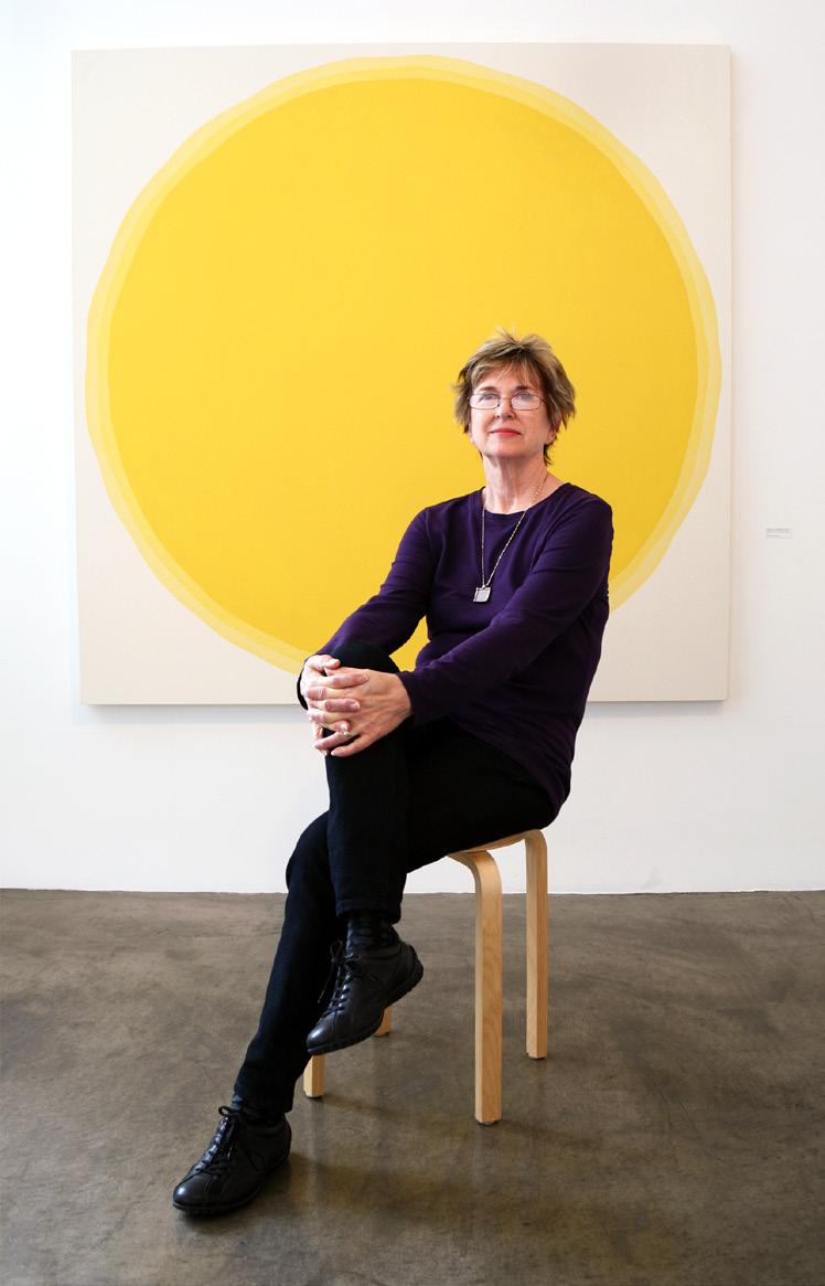 Dawn Arrowsmith produces meditative, color-driven works informed by Buddhist philosophy and extensive travel. Her paintings appear minimal at first glance, gradually revealing optical shimmer and depth through prolonged viewing.
