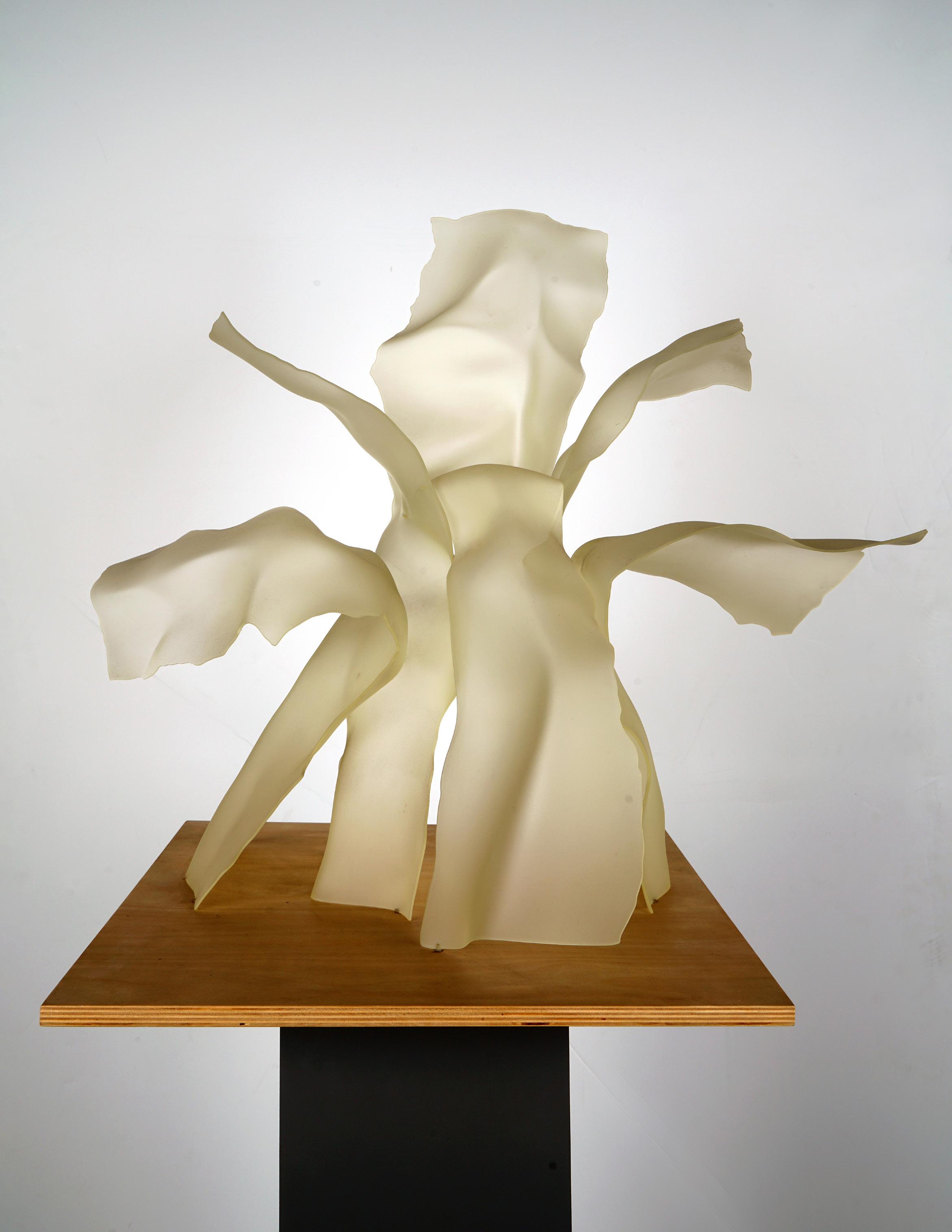 Gehry’s Memory of Sophie Calle’s Flower translates this architectural, participatory structure into a more intimate sculptural form. Cast in translucent urethane and reduced in scale, it reads as a distilled, almost ghostlike remnant of the original. Yet it retains key architectural concerns: structure, surface, and spatial presence. In this way, the work operates simultaneously as sculpture, architectural fragment, and conceptual trace— demonstrating how Gehry’s practice moves fluidly between disciplines. It embodies his ongoing dialogue with artists and his interest in giving physical form to ephemeral, poetic ideas.