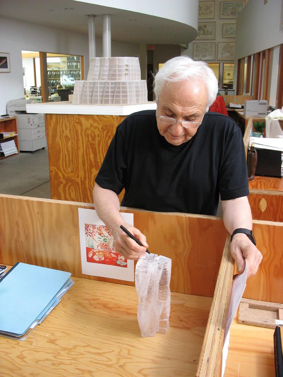 Frank Gehry (1929–2025) was among the most influential architects of the modern era, transforming city skylines through a de-constructivist approach and an inventive use of materials. His buildings—defined by shifting surfaces, fragmented forms, and a sense of movement— blur the line between structure and sculpture. As his longtime friend, artist Charles Arnoldi, observed, “It was when Frank began thinking of his buildings as sculptures and art that things really changed.”