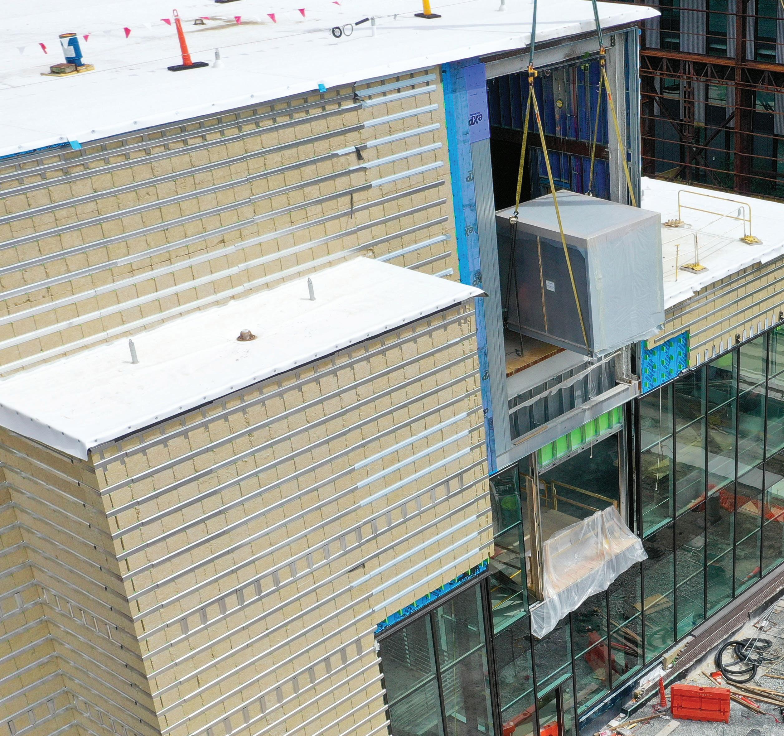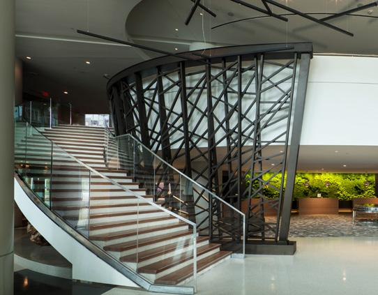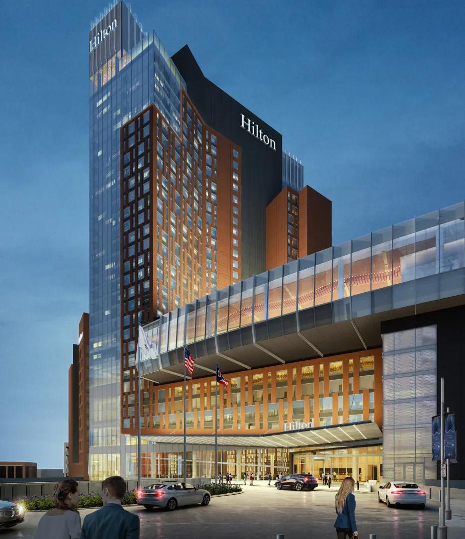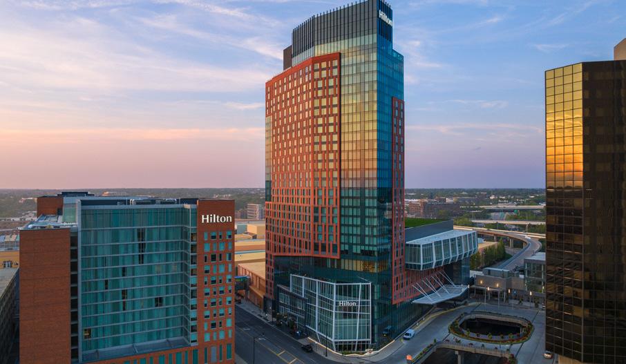 Transforming the Downtown Columbus skyline, the Hilton Downtown Columbus Hotel underwent a remarkable expansion. This 29-story addition, spanning 460,000 sf, was constructed on a site of less than 1 acre in a densely urban area while navigating stringent zero lot line restrictions. This site was situated on the southwest corner of the bustling Greater Columbus Convention Center along North High Street and was tightly restricted by bridges and railway. This new tower boasts an impressive addition of 463 guestrooms, 54,000 sf of meeting space, a relaxed lobby bar, a rooftop bar, multiple dining establishments and a new guest registration area. One of the project’s notable feats involved connecting it to the existing Hilton pedestrian sky bridge spanning North High Street. Structural tie-ins to the pedestrian sky bridge, a corridor above the convention center ballroom and a connector corridor under the High Street bridge allowed seamless integration into the existing Hilton.