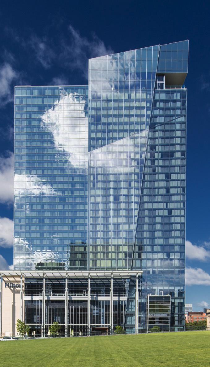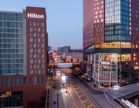 The Hilton Cleveland Downtown connects to the Global Center for Health Innovation and Convention Center. The hotel features a 28-story tower filled with 600 guest rooms positioned atop a four-story podium of ballrooms, meeting space, retail space, and lobby. The hotel also features a rooftop bar, as well as underground connections to the Cleveland Convention Center and the Global Center for Health Innovation. This project is LEED Silver Certified.