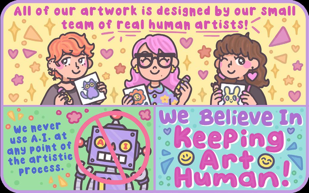 Driven by a passion for art and creativity, we aim to make people laugh with our silly puns, inspire with our imaginative designs, and enrich the human spirit by nurturing the child within us all, one sticker at a time!