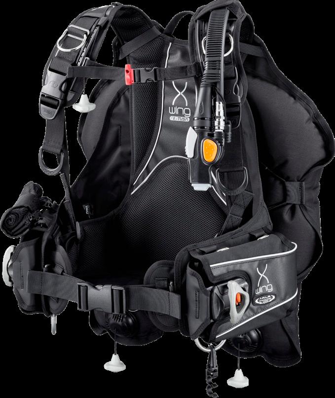TUSA’s Ultimate Stabilizing Harness completely eliminates tank roll and delivers an amazing fit. The U.S.H. securely holds the air cylinder in place with optimally placed rails and brings the tank closer to the body increasing tank control while reducing weight. The Waist Support System significantly enhances comfort and fit by dispersing the weight load around the hips. The W.S.S. integrates the adjustable shoulder harness system with the rear stabilizing plate and cummerbund to effectively unload the hips while ensuring a snug fit.