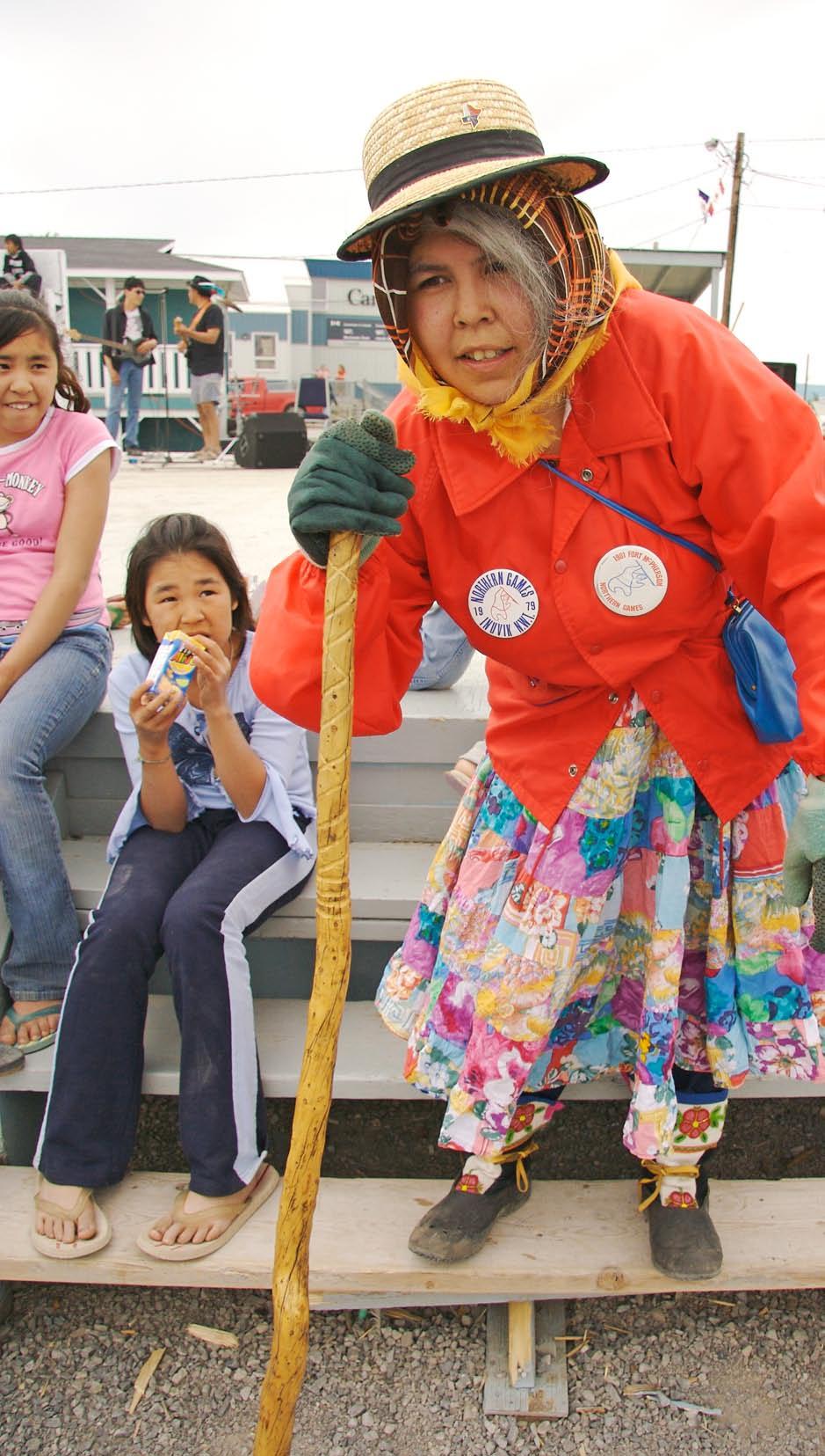Joe Nasogaluak showed us his carving-in-progress of a wolf dancer. “It’s called “Worn out mukluks”, he said. “It’s been a fun weekend for everyone, I am working in this tent with my son, my brother and my cousin.” He has attended most of the Arts Festivals ever since it began, and is in Inuvik mainly to work on a large scale sculpture commission. He also wanted to show Marnie Hilash, the show’s organizer, his family’s support as they have known her for many years from her work in Tuktoyaktuk. Joe and Eli took first prize at Canada’s Snow Sculpture Competition in 2002, with a spectacular carving called “After Ragnarok: A New Beginning,” and enjoy international fame, creating works that evolve continually in artistic expression and integrity.