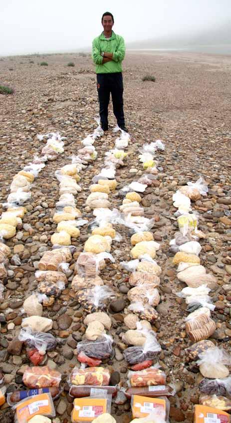Noel Cockney displays the ration of dry-food supply left-half way through the program. Group photo. Front left: Mark Hamlin, Swen Ugyuk, Haley Smith, Hope Makpah, Shannon Ciboci, Martha Arnarauyak, Jennifer Moran, Tera Yarema, Zakkery Kudlak, and Caine Akukujuk. Back: Lance Gray, Paulou Ittungna, David Kullualik, Noel cockney and Geoff Kooy.