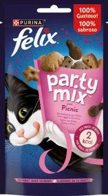 Felix Party Mix. Knuspriger Trockenfutter-Snack für Katzen, in verschiedenen Formen und mit Geschmacksrichtungen wie Huhn, Truthahn und Käse erhältlich, 60 g pro Beutel