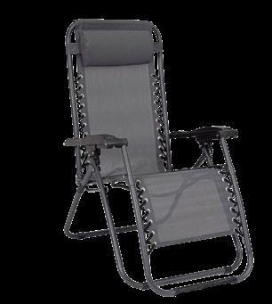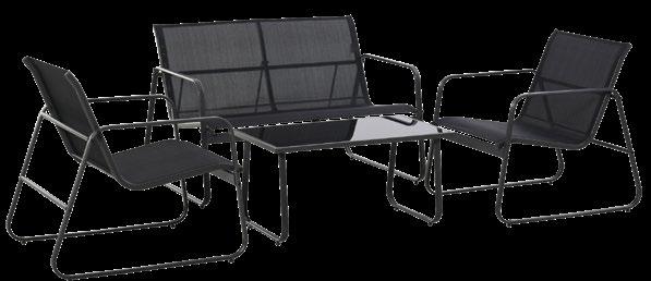 Mod. G onzalo. Struktur aus phosphatiertem un d pulverbeschichtetem Stahl für den Außenbereich (Polyester), mit Sitzfläche und Rückenlehne aus Textilene 2 x 1 (550 g/m²), Beistelltisch mit lackierter Glasplatte aus gehär tetem Glas (Stärke 5 mm). Ab März erhältlich.