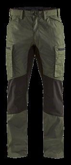 Stretch. Aus 65 % Polyester und 35 % Baumwolle, mit Stretch-Einsätzen an den Knien und im Schritt, Farben Grün / Schwarz und Grau / Schwarz, in verschiedenen Größen erhältlich