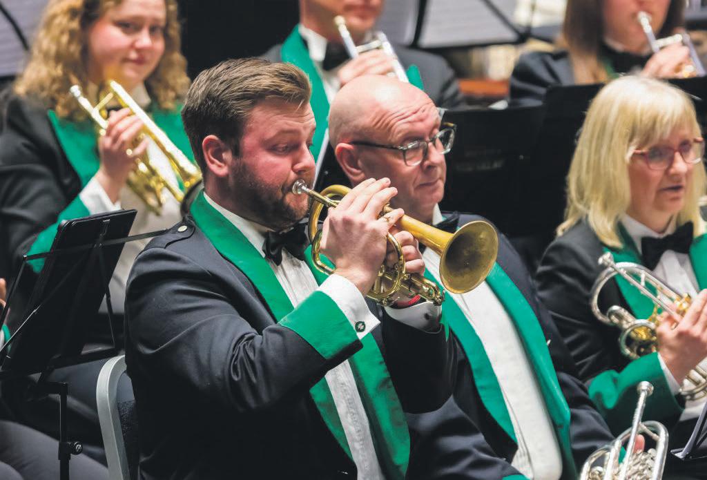HOLDT SEG I DIVISJONEN : Agder Brass spilte konkurransestykket “The Patriots” i den store Grieghallen fredag, og er godt fornøyd med å holde seg i 2. divisjon etter fjorårets opprykk.