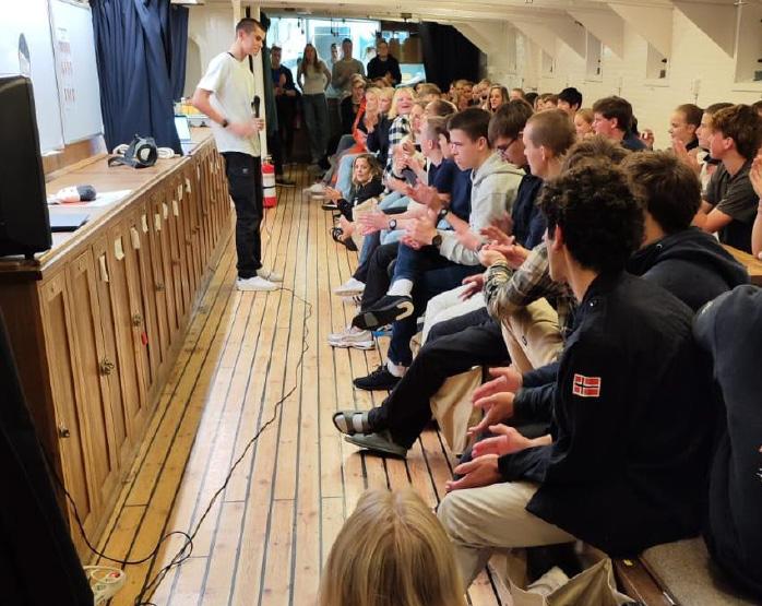 Etter maritim opplæring begynte vg2-undervisningen forrige mandag. Selv midt i disse utfordrende dagene for seil har etablering av daglige rutiner gjort livet om bord på skipet stadig mer håndterlig. På den maritime siden har elevene våre flittig lært om skipet og forbereder seg til sin første prøve, hvor de må vise at de kjenner alle tauene.