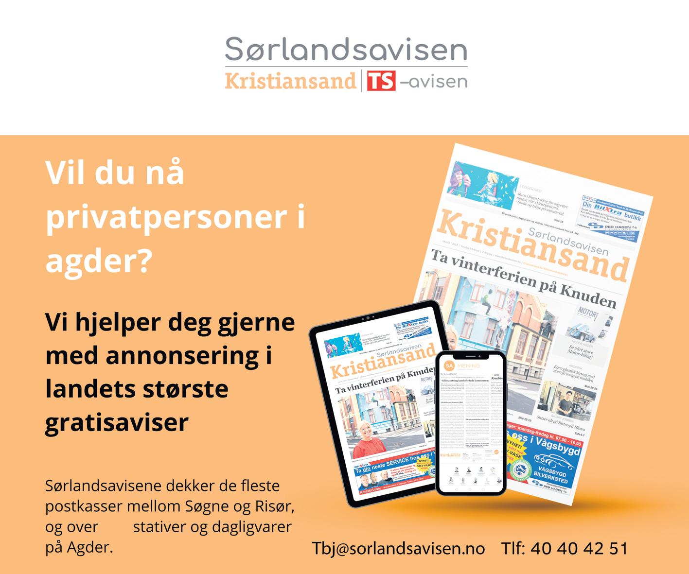 Annonsebestilling: annonser@sorlandsavisen.no