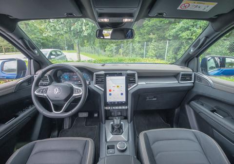 Vi sitter selvsagt høyt i en massiv pickup som Amarok er, og sikten ut er god. De utvendige speilene er noen av de største vi har sett og bidrar ytterligere til god oversikt ut og til siden. Bilen er svær, måler godt over fem meter i lengde, men føles likevel enkel å håndtere i vanlig trafikk. Trange parkeringshus kan imidlertid bli en utfordring. Komfortable seter med elektrisk justering gjør det enkelt å finne en god sittestilling for sjåfør og passasjer. Bak de to er det et stort «tomrom» som egentlig har plass til baksetet. Det rommer en anseelig mengde bagasje i tillegg til det man laster på planet. Rulledeksel til dette er ekstrautstyr.