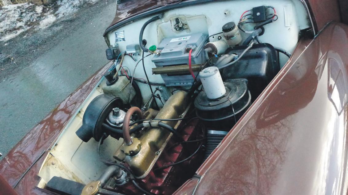Han mener motoren har over 80 hestekrefter, men må sjekke vognkortet for å finne teknisk informasjon. – 1778 kubikk, leser han. Bredden er 160 cm, og lengden er 4,4 meter. Det er fire gir på den. Jeg vil tro den kommer godt over 120 km/t, men jeg har aldri kjørt noe fortere med den, selv om den er kjapp i akselerasjonen.