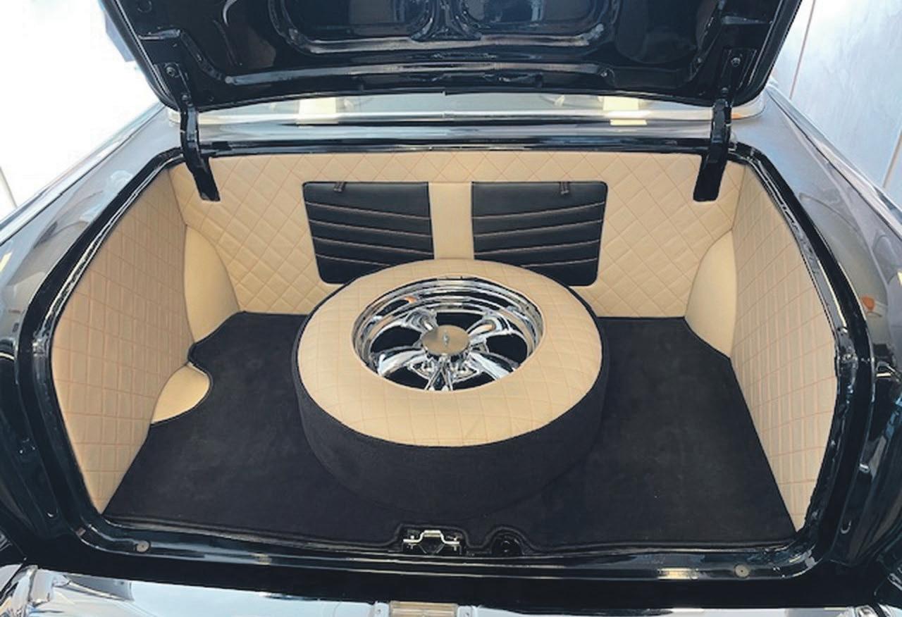 EGET HÅNDVERK: I kofferten har Svein implementert sitt eget verk. Med over 50 års erfaring som møbeltapetserer, har han vist frem egne kunstner i bagasjerommet. Foto: privat