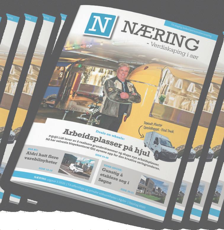 2 NÆRING - Verdiskaping i sør - 2022 – Per fekt til å for telle om årets gode løsninger og nyårets begivenheter – Post-distribueres direkte til bedriftsledere i HELE fylket – Flotte og aktuelle temautgivelser, tips oss gjerne Ny utgivelse: Desember Kontakt oss for tips og annonsering! tbj@tvende.no Tlf: 40 40 42 51 FÅ DIN EGEN Repor tasje Kun 10.000,SKREDDERSYDD FOR DEG – Sørlandets største Næringsmagasin til HELE Agder NÆRING Verdiskaping i sør NÆRING er et næringslivsmagasin utgitt av Tvende Media med fokus på bedrifter og næringsliv på Sørlandet og i hele Agder. NÆRING distribueres av Posten til offentlige og private virksomheter i Agder.