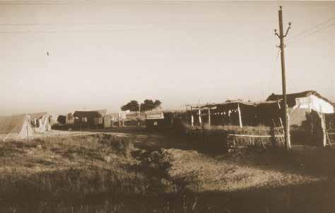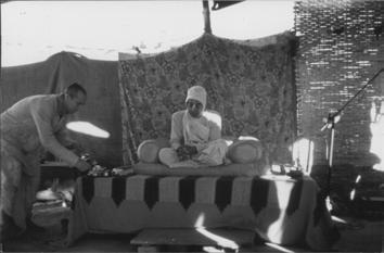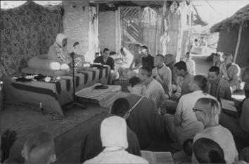 The second small building, about twenty-five feet from Çréla Prabhupäda’s hut, was a tiny temporary temple room. A shabby canvas roof spanned the open area between the two buildings, and Çréla Prabhupäda’s vyäsäsana was beneath this, arranged so he could lecture at outdoor gatherings. Two rented tents had also been erected on the land, to accommodate visiting devotees during Çréla Prabhupäda’s stay. Çréla Prabhupäda’s outdoors toilet, about twenty-five feet behind his hut, consisted of a latrine and a separate area for bathing.