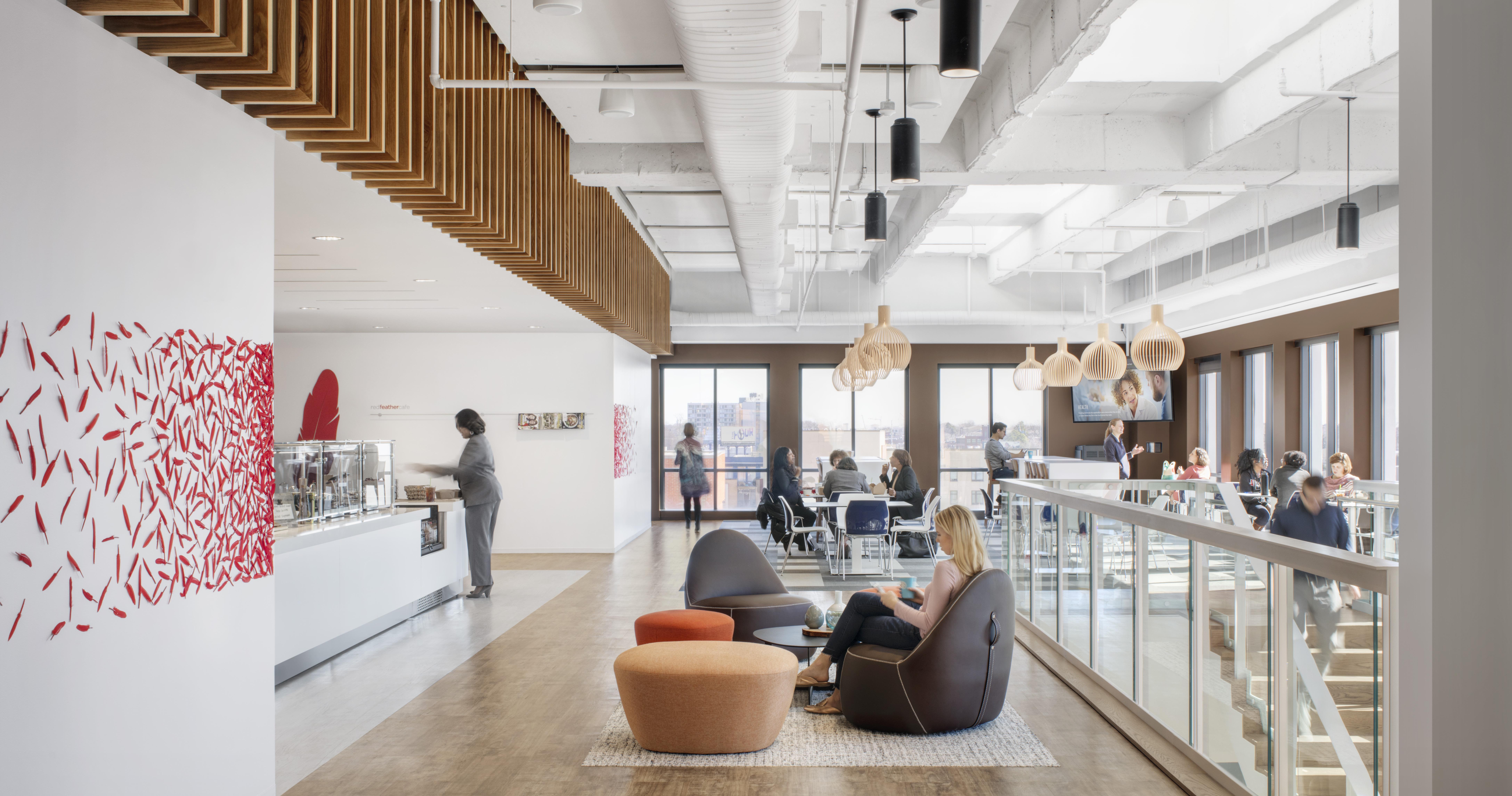 Designed with the employee and client experience in mind, a large work café provides different work environments that support a variety of work styles